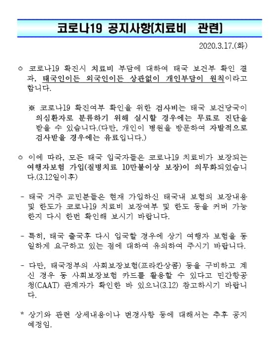 대사관 공지에서 올라온 태국인과 외국인이 상관없이 개인부담이다 라는 말은 사실로 보기 어렵다. 그래서 10만불 (약1억2천만원) 보장 받는 보험을 들어야 태국에 입국 허가를 하고 있다. 태국 여행은 당분간 불가할 것으로 보인다.