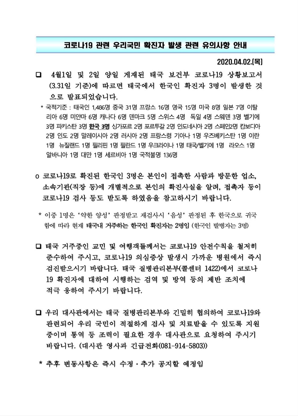 - 4월 1일 및 2일 양일 개재된 태국 보건부 코로나 19 상황보고서 (3.31일 기준)에 따르면 태국에서 한국인 확진자 3명이 발생한 것으로 발표 되었습니다.