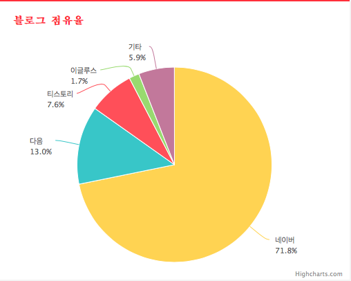 블로그를 시작할 때 여러가지 원하는 바가 모두 다르지만 대부분 어느정도 소통을 할 수 있고 유입자가 많은 곳을 선호할 것이다. 개인적으로 네이버 블로그가 훨씬 초기 유입이 빠르다. 하지만 네이버 블로그를 하지 않고 티스토리를 운영하는 이유는 아무래도 어느정도 속도가 붙고 나면 확 치고 나가는 느낌이 강하다. 그래서 티스토리만 운영하고 있는데 블로그 통계를 내주는 사이트에서 확인해보니 아무래도 네이버가 제일 점유율이 높았다. 역시나 ! 점유율 순위별로 보면 네이버, 다음, 티스토리, 이글루스, 기타로 나온다. 근데 1위와 2위의 차이도 큰게 아니라 전부 다 합쳐도 1등한테 안된다. 역시나!