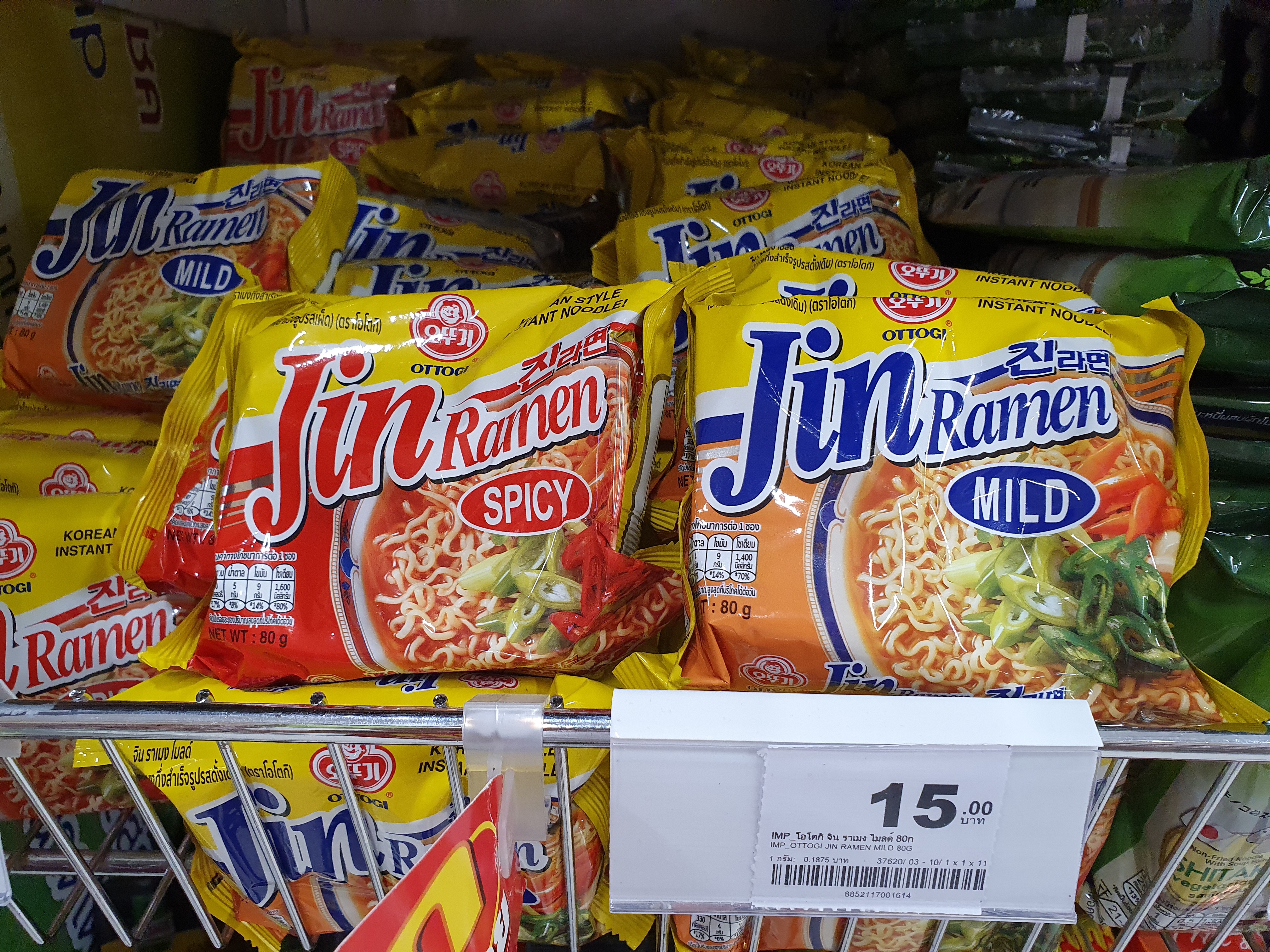 앙증맞은 사이즈 80g 짜리 진라면인데 매운맛, 순한맛 두가지가 태국 마트에서 15바트 (한화로 585원) 에 판매 되고 있다. 보통 한국 사이즈의 한국 라면은 50바트 이상이니 상당히 접근하기 좋은 가격대와 용량으로 승부 보는 것 같다.