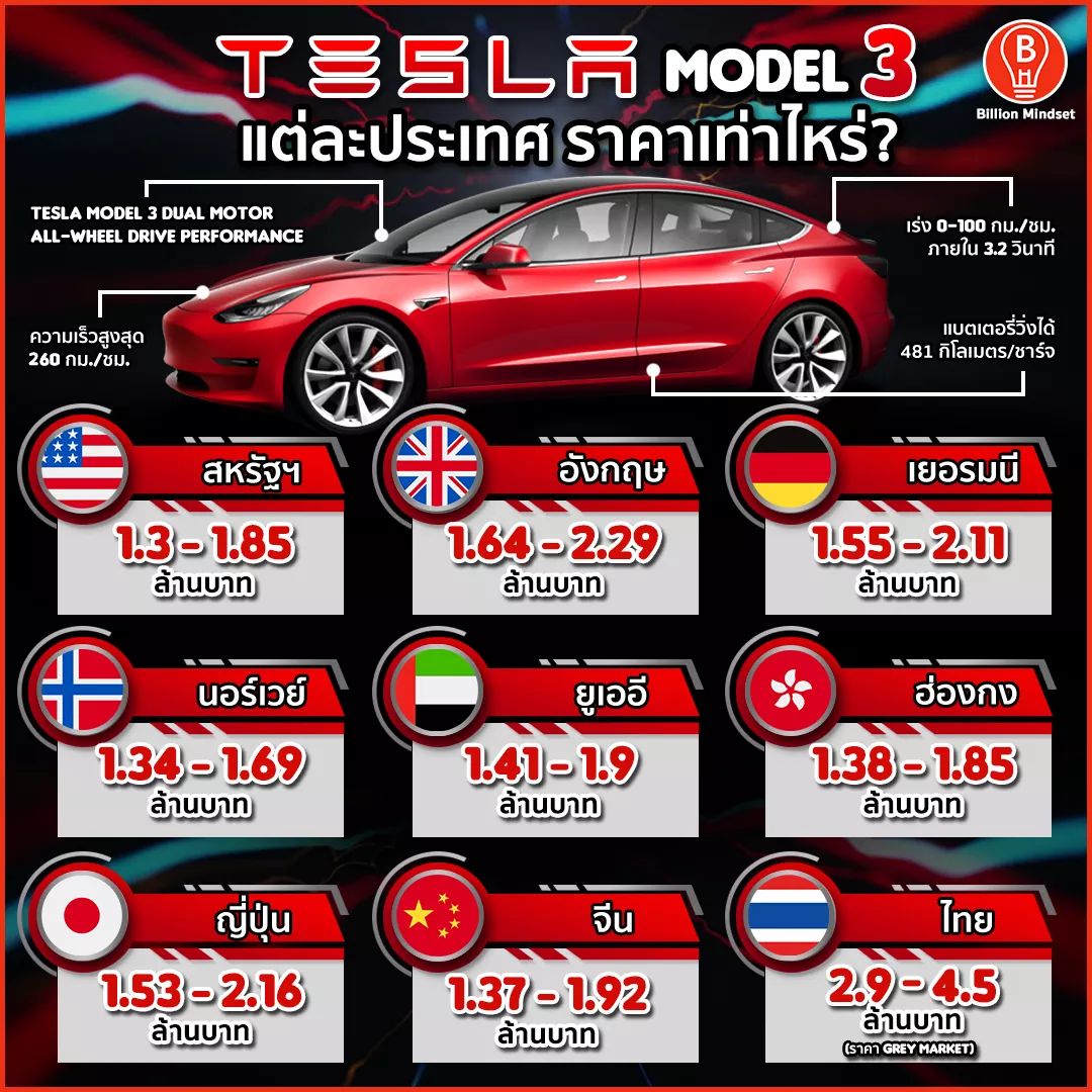 테슬라 모델 3의 전세계 가격에서 미국은 130만바트(약 5천만원) 부터 시작되고 중국, 노르웨이, 홍콩은 거의 비슷한 시작가를 형성하고 있고 UAE, 일본, 독일, 영국순으로 높아지고 태국은 정식 출시하지 않고 수입상을 통한 수입으로 290만바트(약 1억 1천만원) 시작으로 가장 높은 가격대를 보이고 있다.