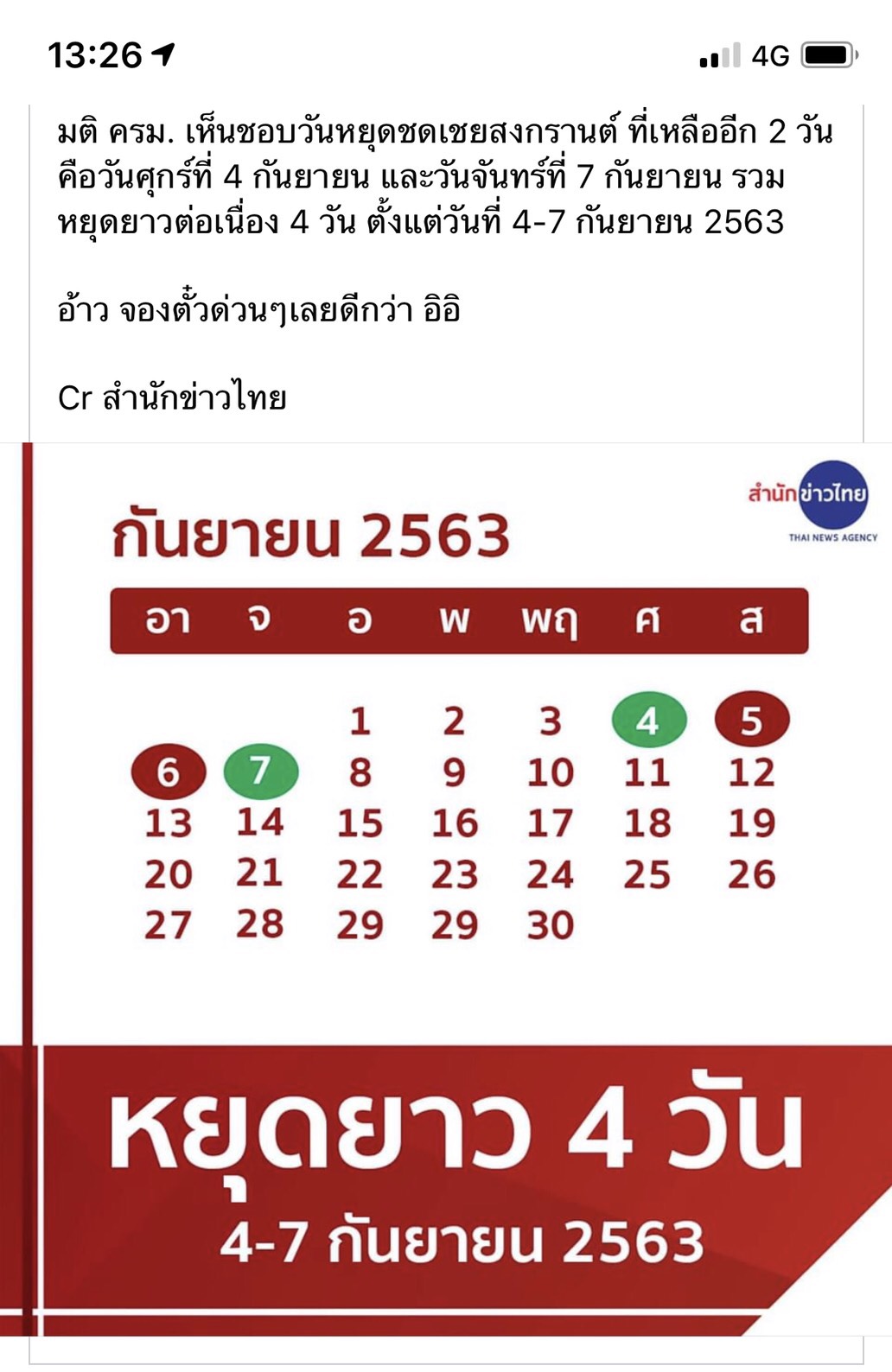 이번달에 대체 휴일로 송크란 휴일을 하루 사용했던 정부가 남은 이틀에 대해서 아직 발표가 없었는데 9월 4일과 7일에 지정하고 곧 발표가 있을 것이라고 태국인들과 뉴스에서 보도가 나오고 있네요. 그렇게 되면 금요일(9/4) 토일 월요일(9/7) 총 4일간의 연휴가 만들어질 것으로 보입니다. 여행 계획을 하고 있다면 예약자가 몰려 가격이 오르기전에 빨리 예약하는 것도 하나의 방법이겠네요.
