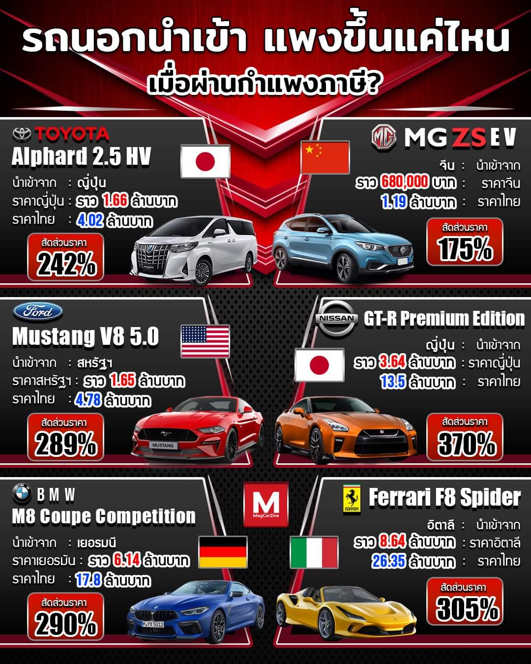 한국이나 태국이나 탈 일은 없는 페라리 F8 스파이더의 경우 8.64M 으로 한화로 3억 3천에 이태리에서 판매되고 있고 태국에 들어오면 딱 10억이 된다.