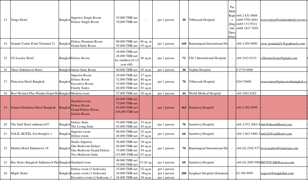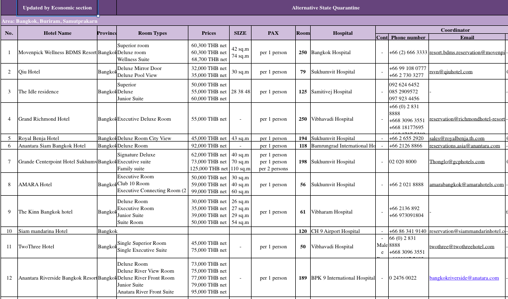 2020.9.15.(화) 기준 태국 정부지정호텔 (ASQ : Alternative State Quarantine) 목록이 발표 되었는데 총 68 군데 호텔과 총 객실은 6404 로 상당히 많이 늘어서 선택의 폭과 일일 수용 능력이 올라갔다고 볼 수 있다. 가장 저렴한 호텔은 29,000 바트이며 르 메르디앙은 200,000 바트까지 가격의 폭도 커지면서 촘촘해진 모습을 볼 수 있다. 방콕 소재 호텔들은 코로나 관련 태국 정부 지정 격리 호텔로 사용하면서 일반 이용객을 안받는 쪽이 이익이 될 수 있지만, 그외 호텔들은 식사 프로모션 등에 집중 하면서 태국 손님 유치에 힘을 쓰고 있다.
