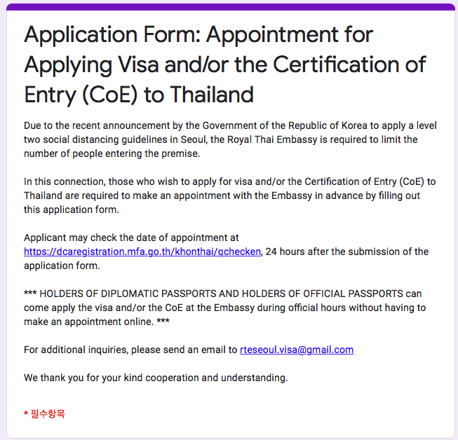 *** 비자 발급을 위해 주한 태국 대사관과 사전에 방문 날짜와 시간을 예약해야 합니다. 방문 예약하지 않을 경우 진행 불가 합니다.