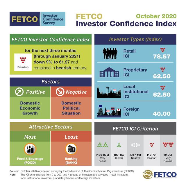 태국자본시장협회연맹(FETCO)은 10월 말에 실시한 주식시장에 관한 조사에서, 향후 3개월(2020년 11월~2021년 1월)의 투자가 신뢰지수(ICI, 0~200 중 높을수록 낙관)가 전월 말보다 9% 하락해, 61.27을 기록했다고 밝혔다. 4개월 연속 하락이며, 3개월 연속으로 '비관(40이상 80미만)'적으로 전망했다.