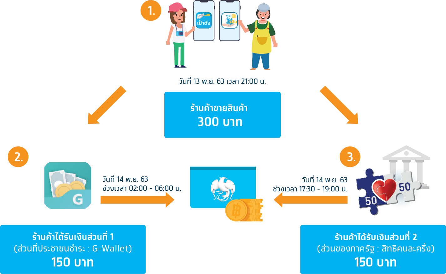 쉽게 풀어쓰자면 "50대 50 반반 (더치페이)" 캠페인으로 태국 국민들이 지역 시장 혹은 상점에서 물건값의 반만 계산하는 것이다. 나머지 반은 정부에서 지원금으로 보내준다. 대형 백화점이나 마트는 이용 불가하고 소공상인 특히 시장 등 어려움을 심하게 겪고 있는 상인들이 직접적으로 수혜를 입어 반응이 아주 뜨겁다. 소비 촉진과 지원 정책을 동시에 수행할 수 있는 획기적인 정책이 될 것이다. 시장에서 국수 한그릇, 튀김 하나 파는 상인들은 확실히 많아진 매출에 싱글벙글이고 반값에 실생활에 필요한 물건을 구할 수 있으니 이용하는 태국 국민들도 좋은 그런 상태이다.