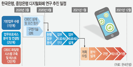 전체 추진 기간은 내년 12월까지 22개월이다. 7월까지 CBDC 시스템을 어떻게 운용하고 어떤 기능을 제공할지 등을 설계하는 동시에 기술 검토를 8월 중으로 마무리한다. 또 데이터 분산 처리 기술인 블록체인(공공거래장부) 활용 가능성, 외부기관 자문 등을 진행한 뒤 내년 1년간 시스템을 구축한다. [출처] - 국민일보