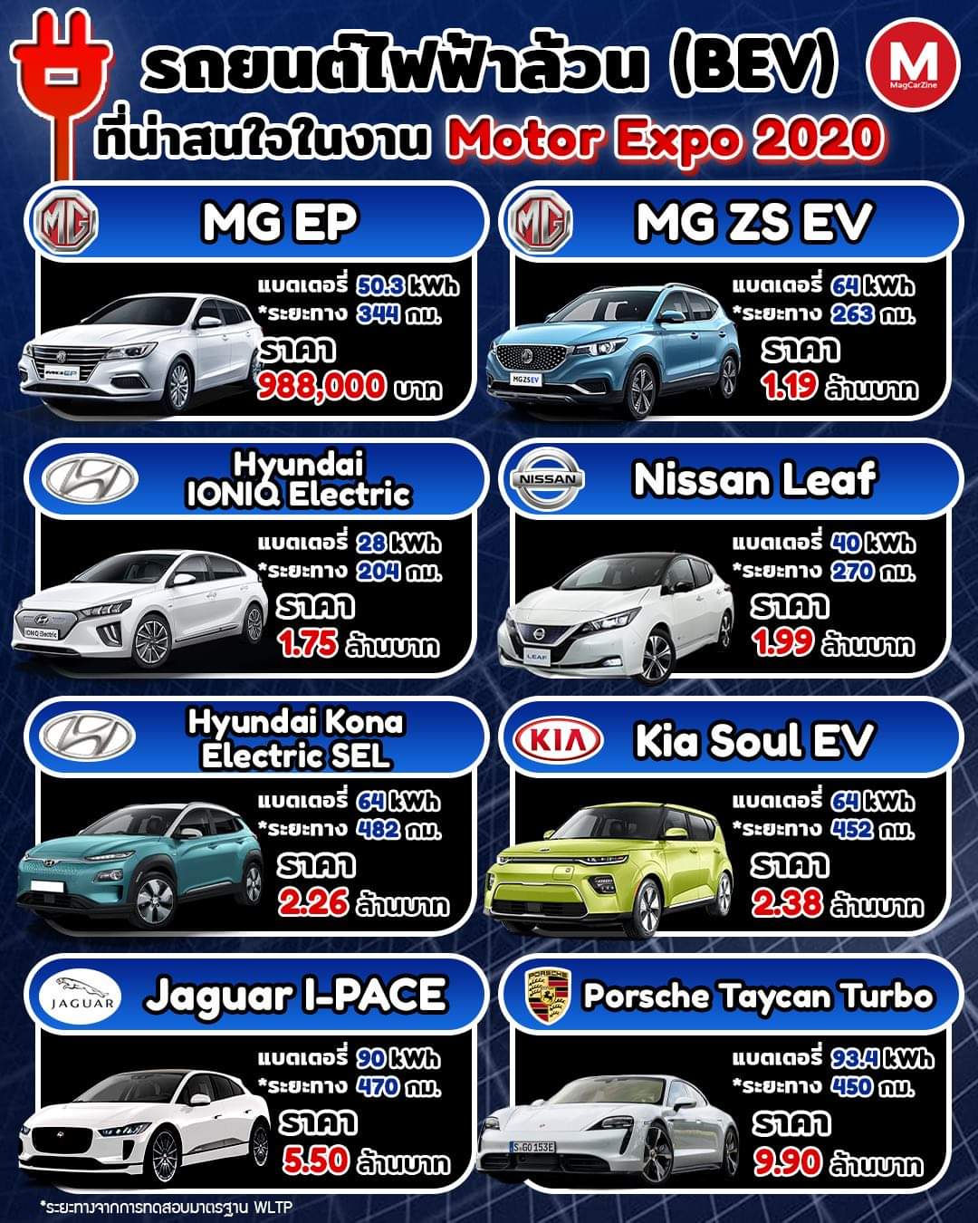 가장 저렴한 모델이 영국에서 중국으로 완전히 넘어간 MG 의 EP가 98만바트 (한화로 약 3천 5백만원) 으로 가장 저렴하고 현재 전기차 비율이 아주 작지만 그중 점유율이 가장 높은 MG 의 ZS 는 코나와 비슷한 크기의 SUV로 1백1십만바트 (한화로 약 3천 9백만원) 이다. 한국에서 이번 출시된 포르쉐 타이칸은 1억 3천만원대의 판매가가 책정되었는데 태국에는 9백9십만바트 (한화로 약 3억 5천만원) 으로 2배는 가뿐히 넘는 가격대를 형성하고 있다.