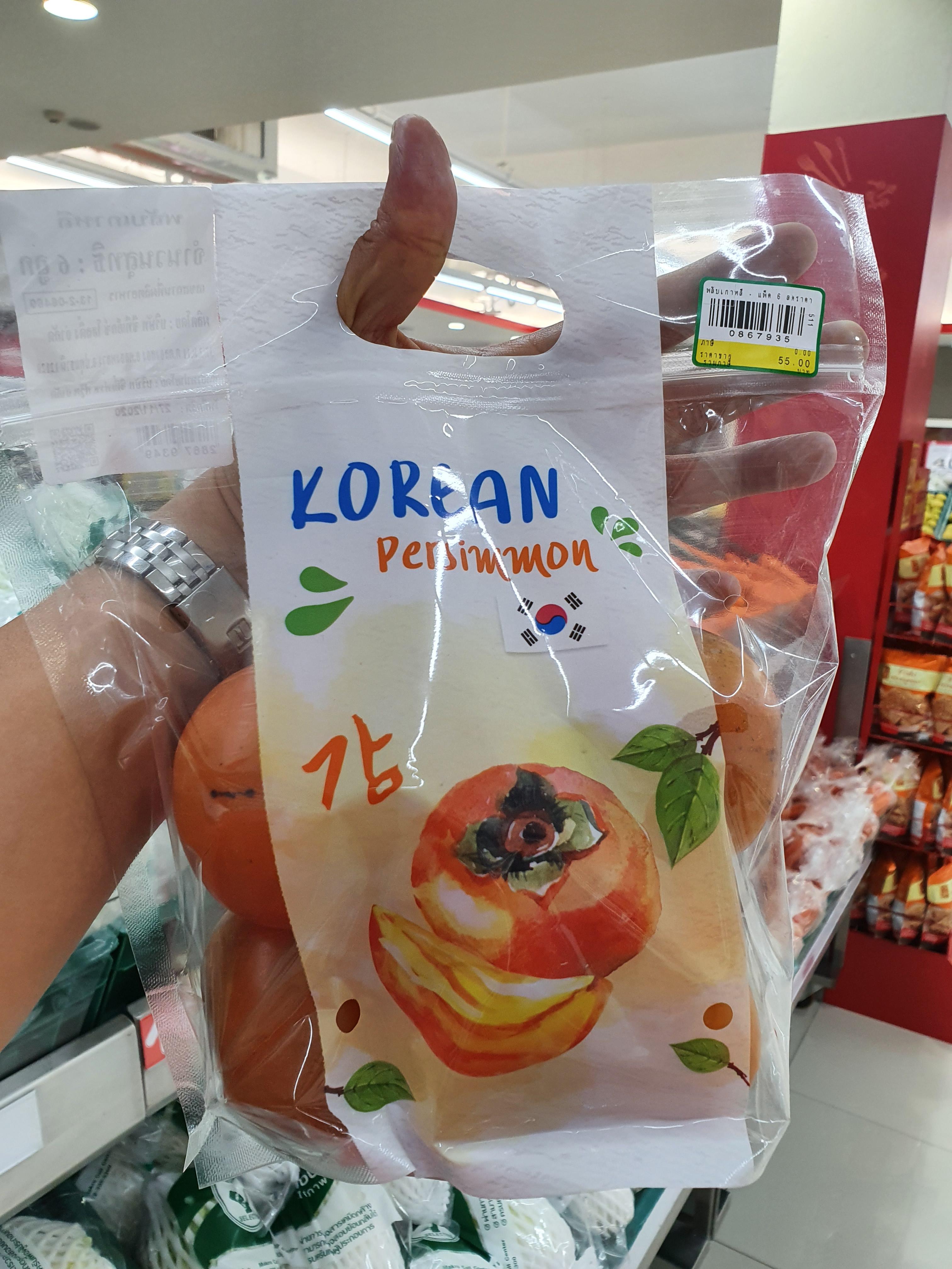 마크로라고 하는 한국의 코스트코 개념과 비슷한 마트에서 한국 감이 직접 수입판매를 하고 있어 반가운 마음에 판매대를 좀 살펴보았다. 중국 감도 한국어를 막 붙여 놓아 태국인들이 한국 제품을 구분하기 어렵지만 관계처에서 조치를 시작한다는 뉴스를 보았다. 점차 좋아질 것으로 보이고 일본제품과 나란히 있었는데 가격대는 거의 반값이지만 둘 다 판매율이 저조해보였다. 일본제품만큼 깨끗한 상태 다른 점이라면 일본제품은 하나씩 포장이 되어 있고 한국 제품은 1 봉지에 8개 정도의 감이 들어 있었다. 그래서 오히려 한국 제품이 더 손에 가겠끔되어 있는데 아무래도 감이라는 제품을 잘 모르다보니 그런 것 같다.
