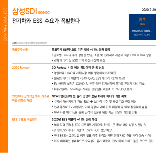 이미 미래에셋에서 지난해 7월 발표한 삼성 SDI '전기차와 ESS 수요가 폭발한다' 라는 리포트를 나온적이 있다. ESS 경쟁력을 갖추고 더욱 견고히 하고 판매율을 높여갈 삼성 SDI 에 높은 기대를 걸고 목표 주가도 수정하면서 예측했는데 오늘 나온 뉴스로 불이 붙을것 같은 느낌이다. 기사 내용처럼 ESS 배터리가 테슬라가 사용하는 배터리와 사이즈가 동일하고 이것이 단순 ESS 배터리만으로 끝이 나지 않고 이어질 가능성을 내다본 것이다.