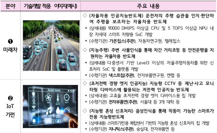 인공지능 반도체를 포함한 시스템 반도체는 수요맞춤형 다품종 소량생산이 주요 특징으로 미래 유망 5대 전략분야 (미래차, 바이오, 사물인터넷, (IoT)가전, 로봇, 공공(에너지 포함))에서 발굴된 수요와 연계한 기술개발 중심으로 과제가 기획되었고, 올해부터 기술개발이 시작되는 과제의 분야별 세부적인 기술개발 내용은 다음과 같다.