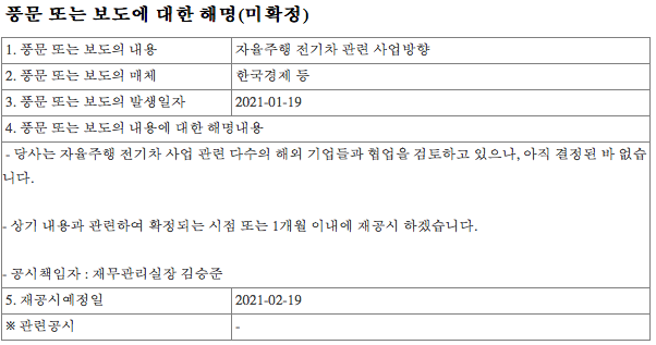 어젯밤 (1월 19일) 장 마감 후 기아차가 애플카를 맡는다는 단독 뉴스가 나오고 계속 뉴스가 쏟아 지고 있는 상황이다. 애플카와 현대와의 기사가 나왔을때 애플쪽에서 먼저 현대차에 제의를 했고 협의 중이라는 내용이였고 현대차는 제의는 있느나 풍문이라며 확실한 사항이 생기면 공지한다는 공시사항이 나왔다. 기아차도 동일한 내용으로 공시사항을 내놓았다. 1월 7일부터 기관과 외인의 공격적인 유입이 있었고 어제 19일 16% 상승과 함께 높은 상한 분위기를 이어가고 있다.