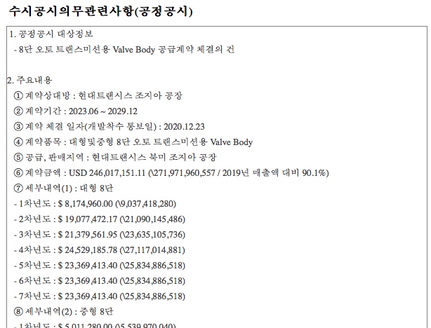 최근 수주 공시를 보면 미국 조지아 공장으로 가는 2700억원 규모의 계약을 맺고 대형 및 중형 8단 오토 트랜스미션 Valve Body 를 납품한다. 현대트랜시스 조지아 공장으로 보내는 것인데 계약기간과 계약 규모를 보았을 때 미국 조지아 공장이 생산량이 늘더라도 품질의 문제가 발생하지 않는상 수혜를 받을 수 있는 관련주로 보인다.