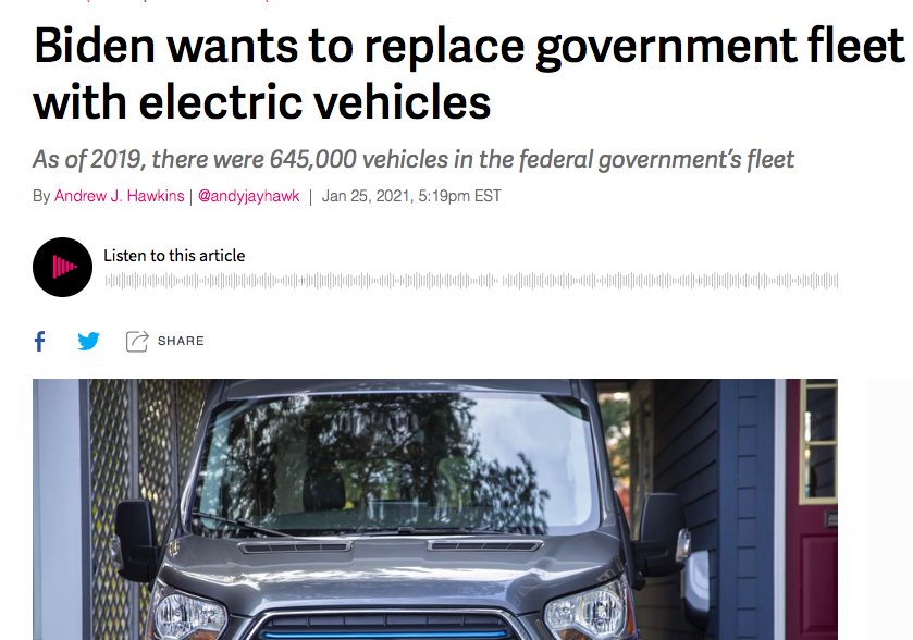 조 바이든 미국 대통령은 정부 차량 총 65만대를 이제부터 전기차로 교체할 예정이라 한다. 테슬라, 리비안 등 기존의 전기차 브랜드에게도 좋지만 GM, 포드 등 전통 자동차 업체도 호황을 맞을 분위기다. 정부 차량을 필두로 전기차로의 변화를 박차를 가할 모양으로 미국이 전세계 전기차 시장의 리더가 되길 바란다고 한다.