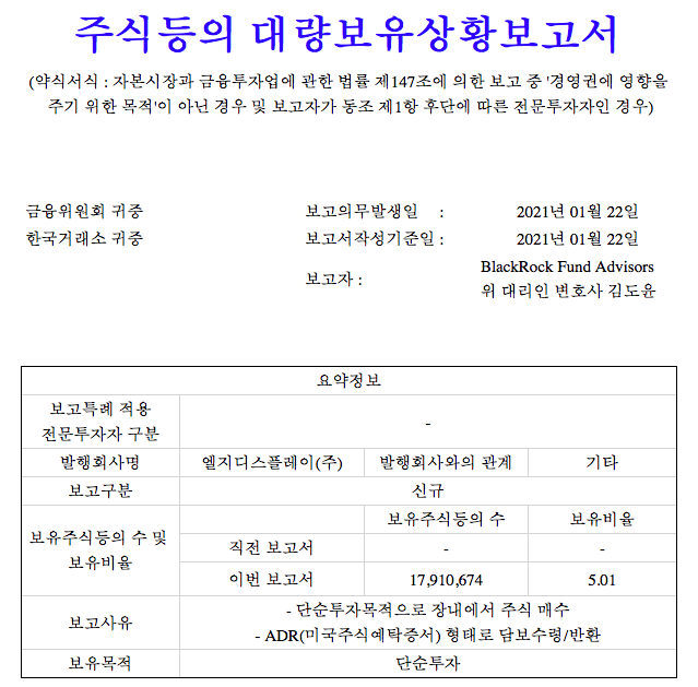가장 최근의 지분 공시 (5%이상) 는 LG 디스플레이다. 요즘 LG 분위기 좋다.