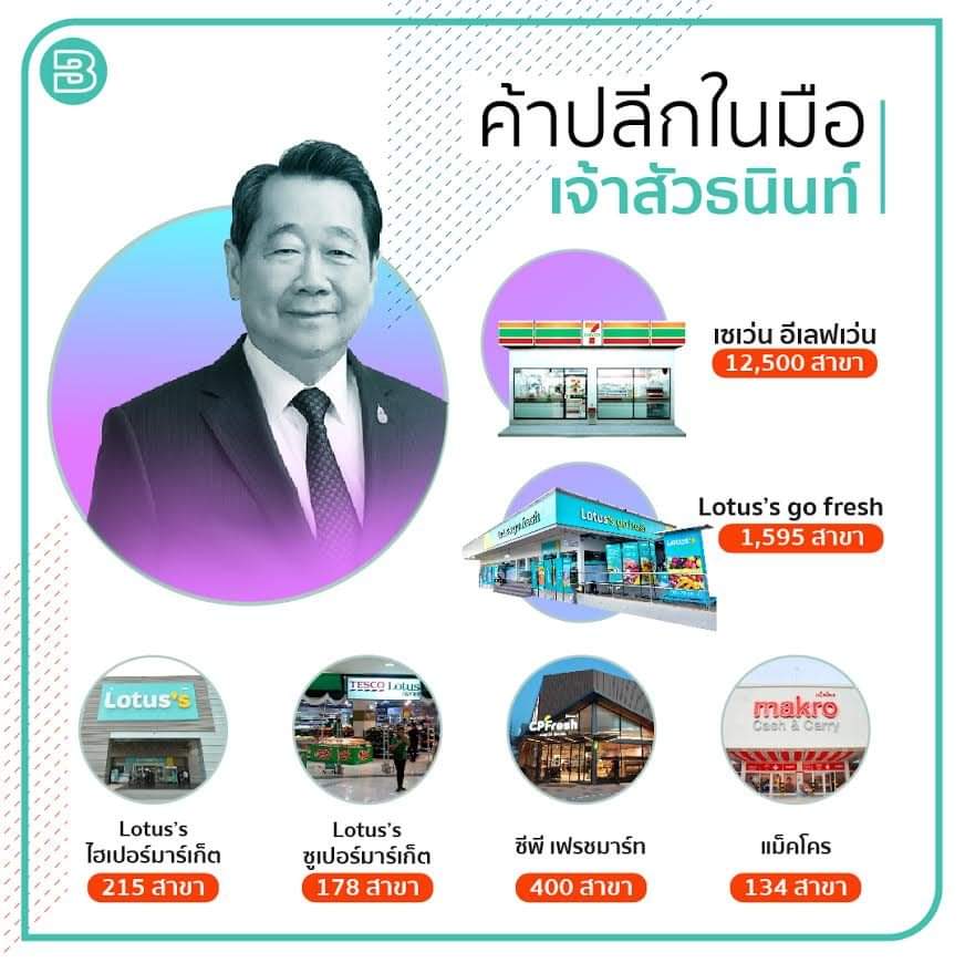 태국 최고 부자는 CP 그룹의 Chearavanont 가문이다. 유통, 통신 등 다양한 사업을 운영 중이지만 근간이 되는 사업은 역시 유통이다. 닭을 키워 계란부터 해외 수출까지 직접 다 하는데 한국에 유통되는 80% 이상의 새우는 태국산이다. 새우도 당연히 한다. 어찌되었든 태국인들에게 가장 친숙하게 CP 그룹과 맞닿아 있는 것은 세븐일레븐이다. 현재 태국 12,500개의 매장으로 일본보다 많은 지점수를 보유하고 있다. 최근에 인수한 테스코 로터스와 그들 모태로 새롭게 출시한 로터스's 등까지 태국인들 입으로 들어가는건 다 한다고 보면 된다.