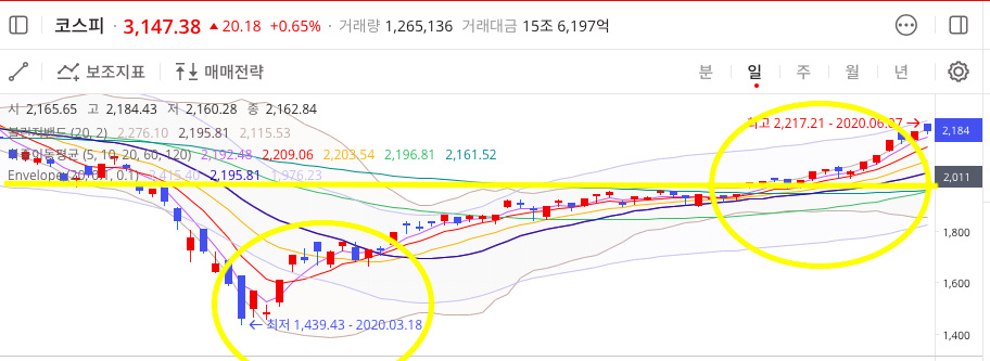 2020년 코스피 차트인데 왼쪽 동그라미가 최저점을 찍은날(2020년 3월 18일)이다. 기억하자. 그리고 2월의 추세선을 쭉 그어보면 두번째 동그라미(2020년 5월 말쯤)에 드디어 2월 수준의 회복을 알린다.