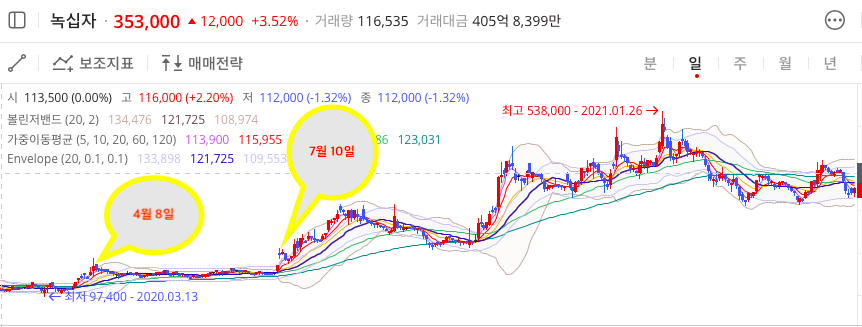 이미 2020년 4월 7일에 주도주를 포착했다면 본인만의 손절 라인을 그리고 기다림의 시간이다. 3월초에 사도 4월에 수익을 이미 보았겠지만 본인의 판단아래 주도주라 판단하면 기다리는 것이다. 체크한데로 4월 8일부터 7월 10일까지 약 3개월이 흐르고 본격적인 렐리가 시작 된다. 보통은 7월 10일 차트의 큰 변화가 있을 때 뉴스에서든 유튜브에서든 이야기가 흘러 나온다.