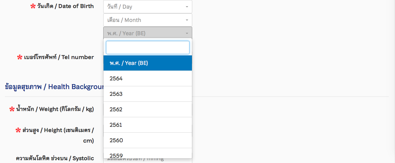 생년월일에서 막힐 수도 있는데 불력을 사용하는 태국식 년도만 표시되기 때문이다. 태국 년도로 계산해주는 사이트를 링크걸어두었으니 확인하고 등록하면 된다. http://dateconverter.net/thai/?hl=en