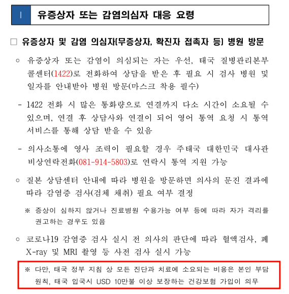 태국에 머물고 있는 한국인들 중에서 부정확한 정보와 정보 부족으로 우왕좌왕 하고 있는 부분이 있어 알고 있는 부분 공유하고자 한다. 가장 많은 이야기가 만들어지는 것이 "치료비" 부분이다. 태국 내에서 코로나 의심이 들어 검사를 진행하거나 양성 판정을 받아 치료를 받으면 일단 원칙상 '본인부담'이다. 태국 정부는 처음 확진자수가 많지 않을 때 무료로 검사를 진행하거나 치료를 해준다고 했다가 외국인도 해당한다고 뉴스가 나온적이 있는데 확진자수가 늘어나고 코로나가 종식되지 않고 시간이 길어지면서 주태국대한민국 대사관에서 정확히 태국 정부의 의견을 전달했다. "검사 및 치료는 본인 부담이다."