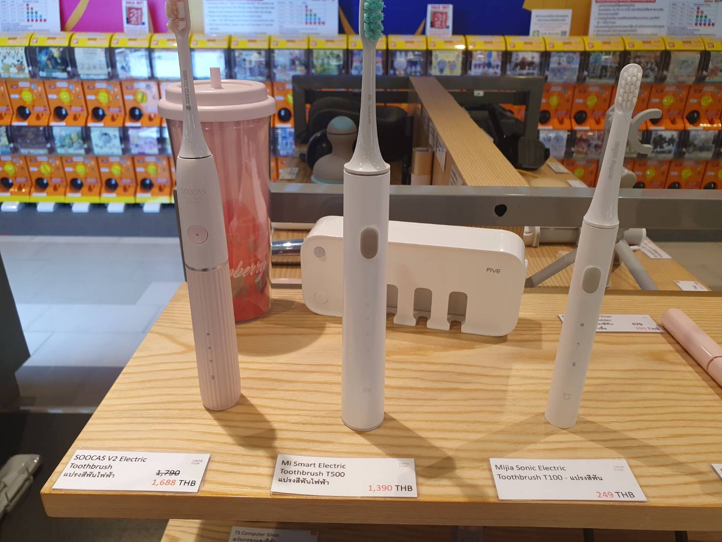 우선 샤오미 매장에는 3가지 제품이 진열되어 있었다. 첫번째로 가성비의 미지아 T100 모델, 그리고 더 진보된 미지아 T500 모델, 가장 디자인이 돋보였던 수카스 V2 제품까지 있었다. 태국 현지 샤오미 정식매장 판매가격은 T100 은 249바트(약 8,767원), T500 은 1,390바트(약 48,941원), 수카스 V2 는 1,790바트(약63,025원) 순이였고 수카스는 할인 행사 중이였다.