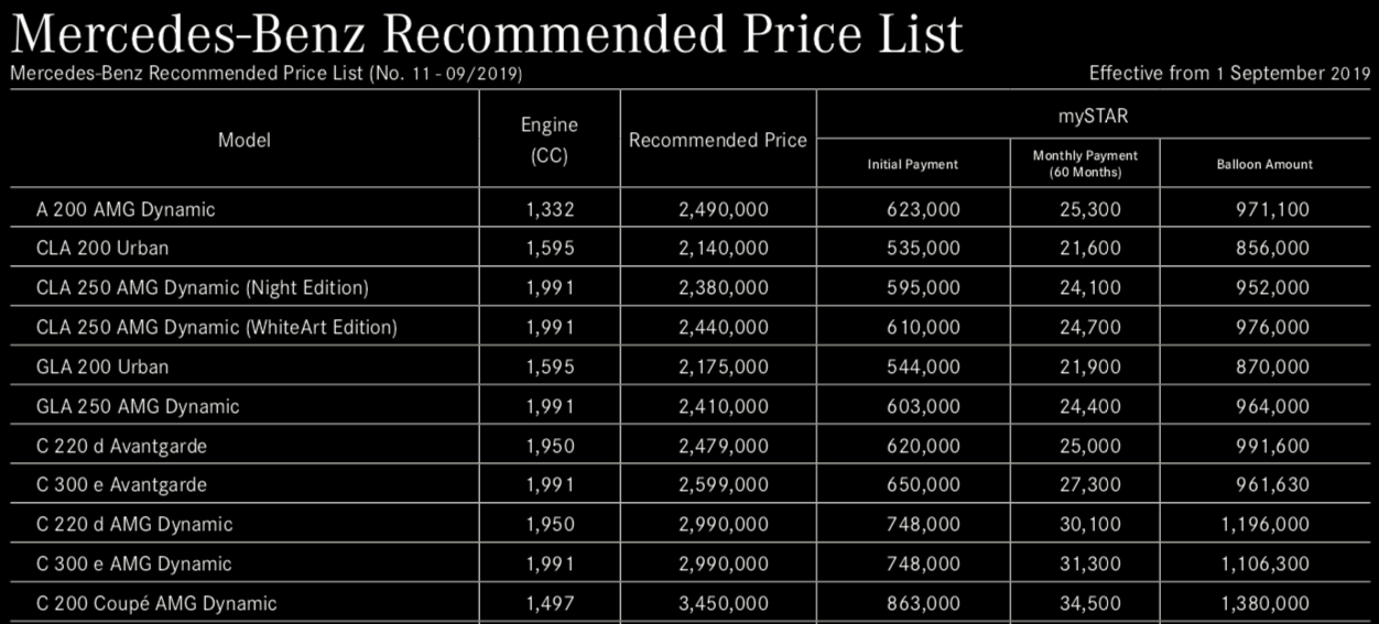 9월 1일에 발표된 태국 정식 벤츠 매장의 가격표로 가장 저렴한 모델이 2,140,000 바트로 CLA 200 urban 모델이다. 1600cc의 모델로 세단 모델에서는 가장 저렴한데 현재 한화(39.21원 이지만 쉽게 39로 계산)로 83,460,00 원이다. 제네시스 G90 시작가가 7천7백만 원이니 태국 벤츠에서 가장 저렴한 세단 CLA의 가장 낮은 등급의 자동차 가격으로 한국에서 제네시스 G90 사고 돈이 남는다.