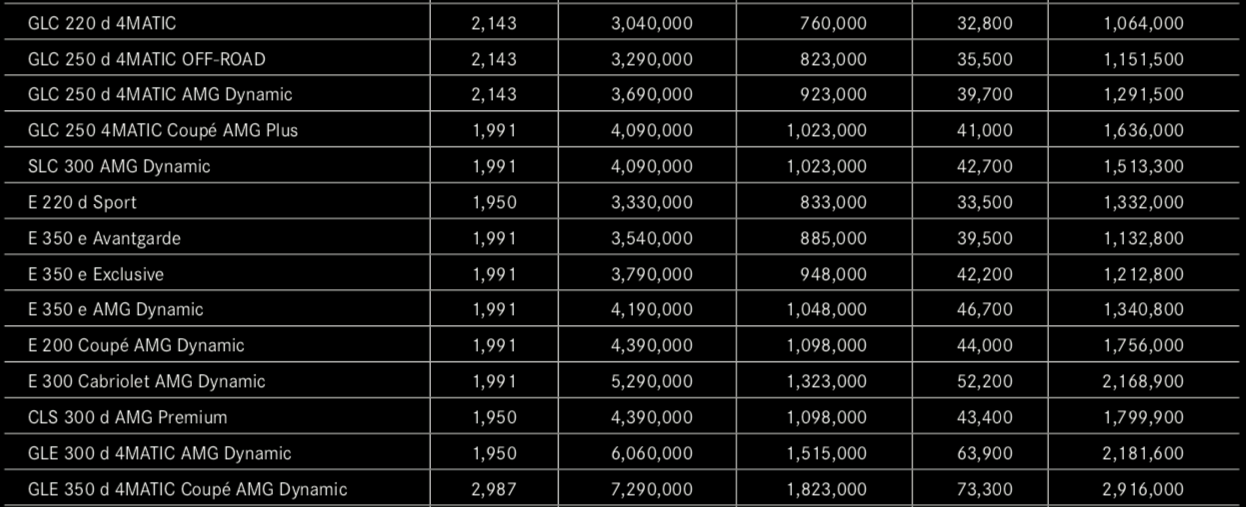 태국에서 SUV 는 GLC 모델이 가장 인기가 있고 일반적인 세단은 C와 E 가 인기가 있는 편이다. 한국에서 많이 타는 E 클래스의 경우 가장 낮은 등급인 E 220 모델이 3,330,000 바트 한화로 1억 2천9백만 원. 한국에서 시작가는 6천3백만 원. 기타 보험료 및 세금 그리고 기름값의 경우 한국보다는 저렴하지만 태국에서 체감상 가격은 한국에서 느끼는 가격과 비슷하다고 할 수 있겠다.