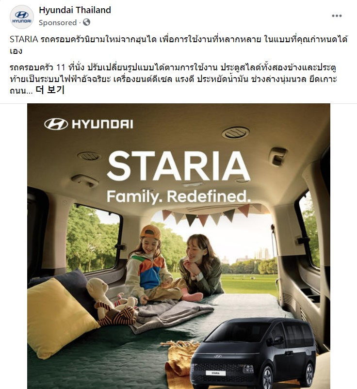 한국에서 유행하는 트렌드를 그대로 홍보 포인트로 삼는 것으로 보인다. 태국 현대자동차는 가격을 낮추기 위해 라운지가 아닌 일반 모델을 태국에 수입을 시작했고 11인승 모델로 흰색을 제외한 3가지 색상만 판매를 시작했다. 홍보를 위해 준비한 차량에서도 저런식으로 차박을 할 수 있다는 점을 강조하고 있다.