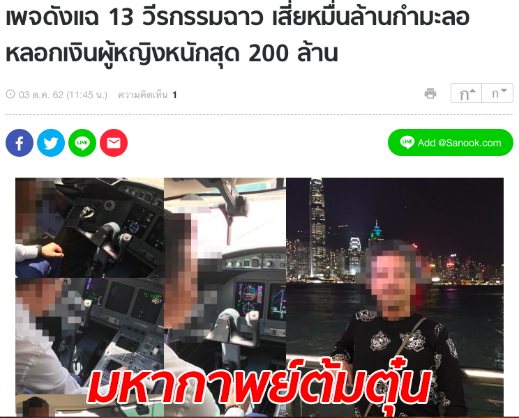 태국 여성은 뉴스에 얼굴을 가리고 방송에 출연하여 처음 만난 곳은 밝히지 않고 방콕에서 만났다고 하였고 당시 조부상을 당해 정신적으로 힘들때였고 망설임 없이 그녀의 고향 부리람까지 가서 아주 잘 도와주고 일 처리를 말끔하게 하면서 주변에서 좋은 사람인것 같다는 이야기를 듣고 본인도 설명할 수 없지만 그에게 빠졌다고 한다. 그리하여 한달이 안되어 부리람에서 성대한 결혼식을 올렸고 3박 4일에 걸쳐 호텔에서 머물면서 결혼식 준비를 하였는데 드레스 비용, 호텔 대관 비용, 결혼식 비용 등 총 3백 6십만바트 정도가 사용 되었고 홍콩 남성은 결제를 미루면서 사라졌다고 한다. 결국 호텔 등은 태국 여성에게 채무 이행을 요구했고 그럴 능력이 없던 그녀는 이혼과 함께 경찰에 신고를 하였다고 한다. 그러면서 본인과 같이 피해를 본 여성이 있다면 알려 달라고 하였고, 하루도 안되어서 쥬얼리 샵을 하는 여성이 비슷하게 홍콩 남자가 접근 하였다고 한다. 그녀는 훠이꽝에 머물고 있고 뉴스 후 그의 사진이 한 장 나왔는데 수티산 작은 콘도에 머물고 있는것 처럼 보였다.