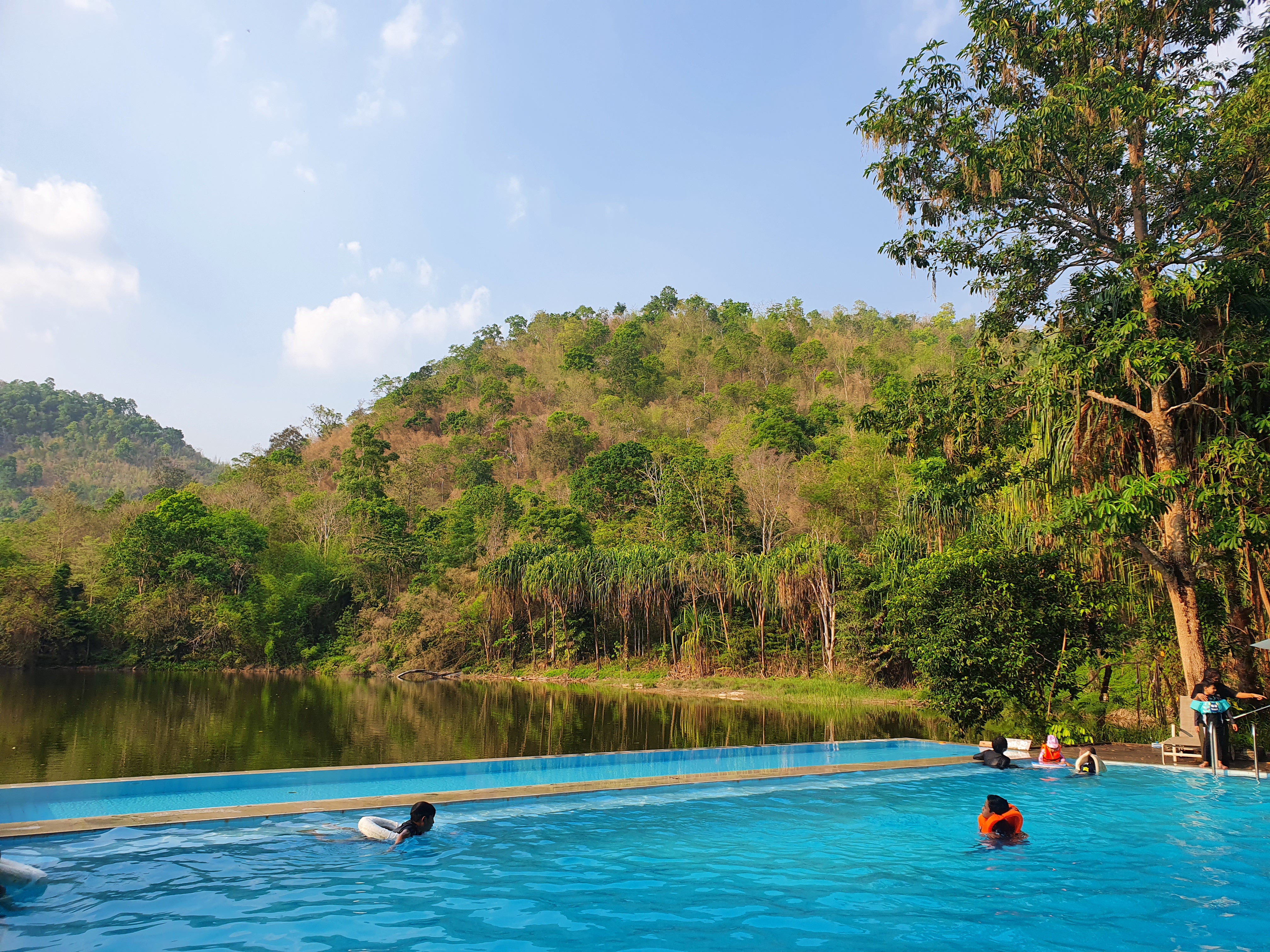 홈푸터이 깐짜나부리 자연 온천 수영장을 다녀왔다. 제일 앞에 있는 90cm 깊이의 온천수가 흐르는 수영장이고 뒤에 넓은 수영장은 180cm 깊이의 일반 온도의 수영장이다. 온천수를 섞어서 미지근하다라고 표현해야 하는게 맞는데 깐짜나부리가 특이한게 기온은 아주 높지만 찬바람이 솔솔 부는 곳이다. 피서를 떠나 계곡으로 가본사람은 이해할 것이다.