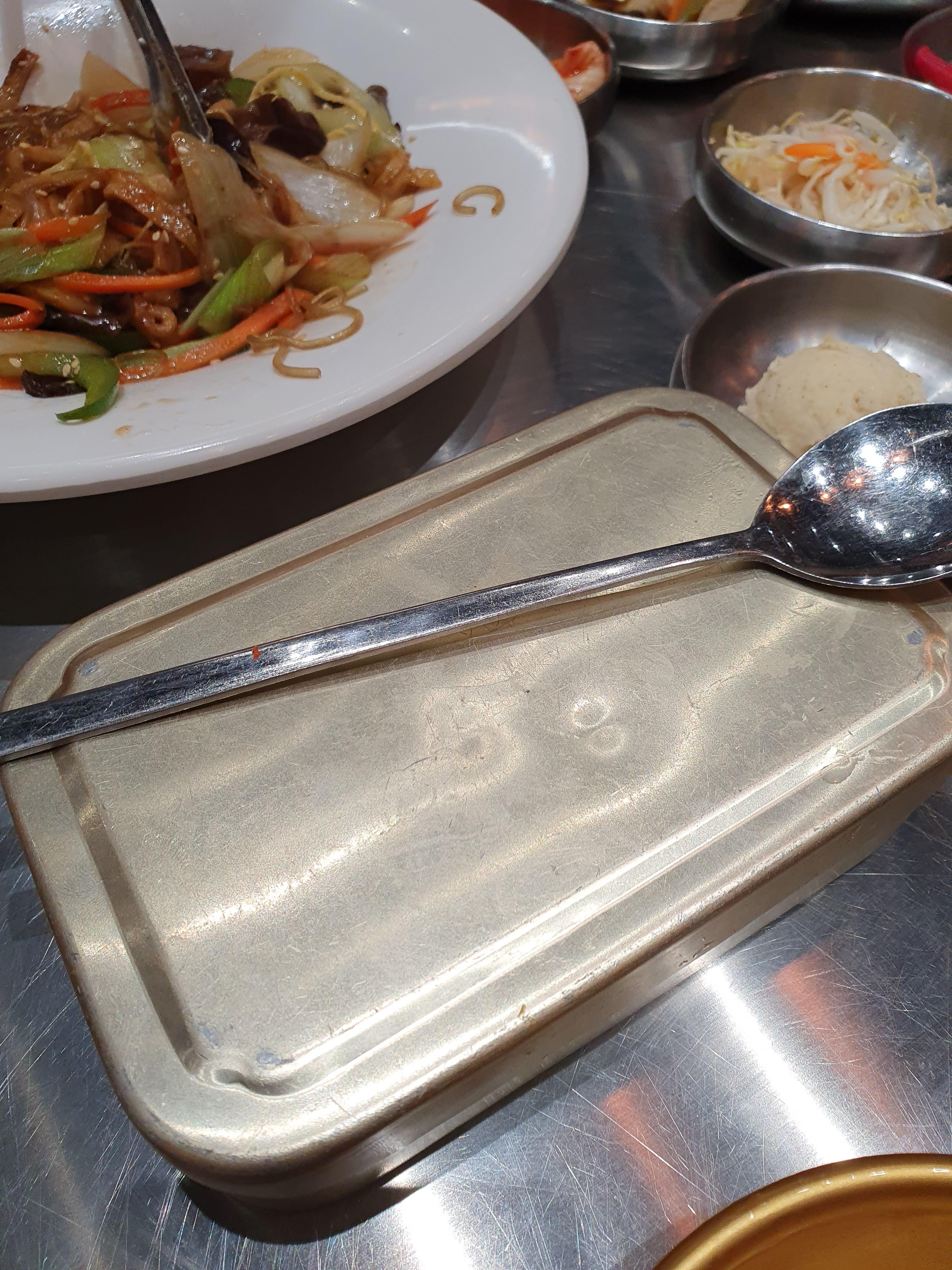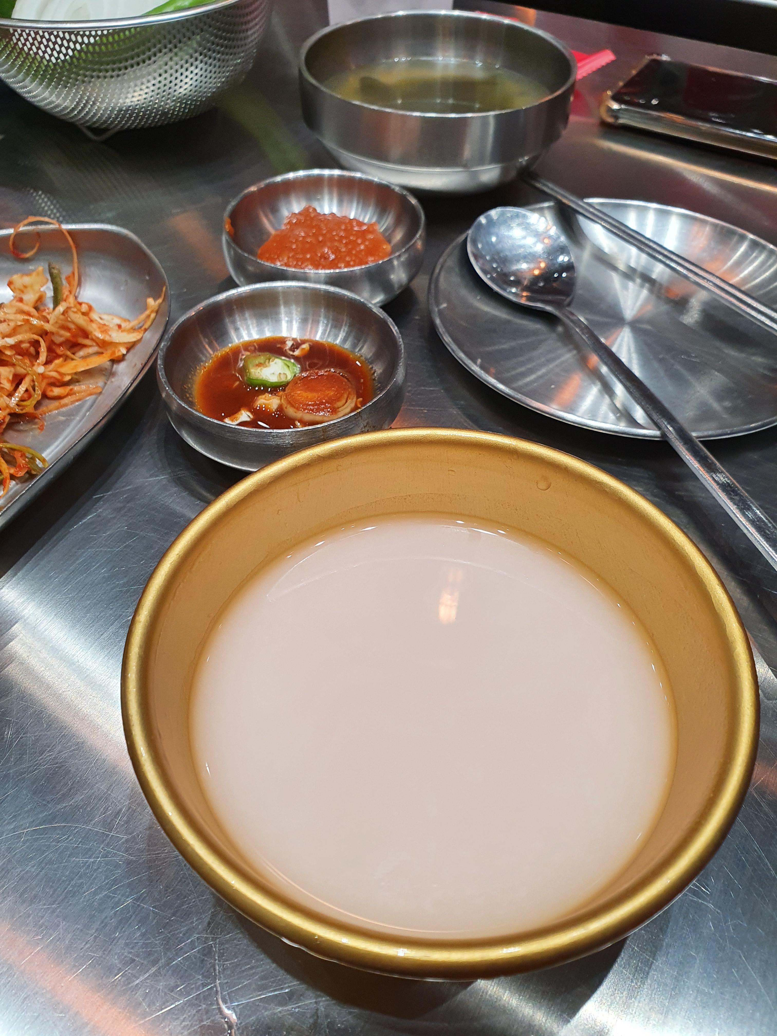 밑반찬은 기본 세팅되고 리필이 된다. 7분 김치찌개는 사실 비벼먹을 수 있게 큰 그릇에 담아주면 김치찌개 넣고 김가루 듬뿍 뿌려서 비벼먹는게 포인트인데 한국만큼 큰 통에 김이 제공되는 건 아니지만 리필이 된다. 아이들은 밑반찬으로 나온 미역국이랑 김 가루를 제일 많이 먹었다. 열탄불고기도 간장 열탄불고기는 맵지 않아서 따로 아이들 테이블에 챙겨줬는데 뚝딱 없어졌다.