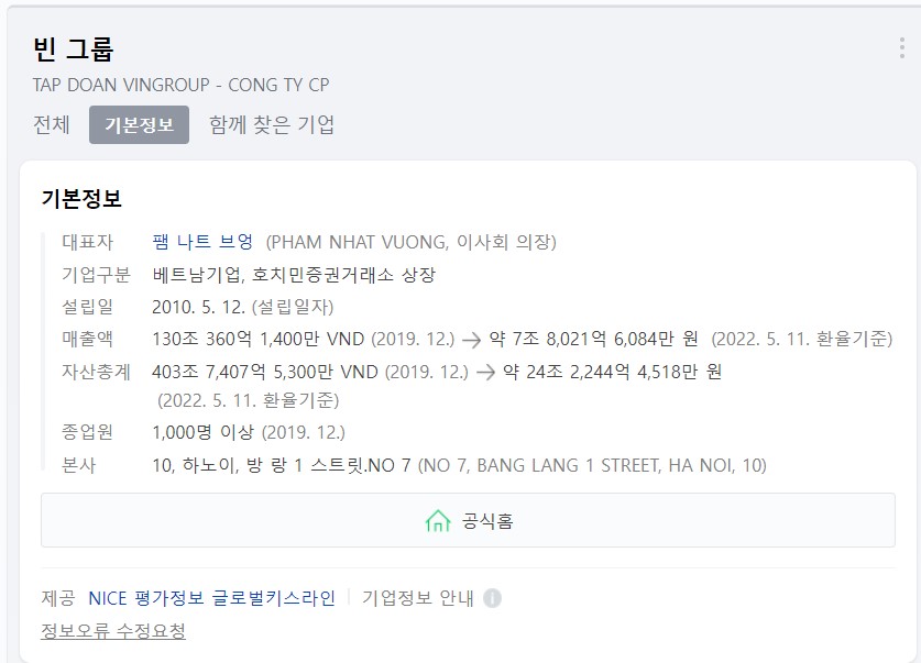 다음은 베트남 빈그룹인데 매출 7조에 자산총계 약 24조다. 태국 CP 그룹에 비하면 계열사 하나 정도 될꺼 같다. 하지만 베트남의 신흥국 이미지를 가장 잘 드러내는 모습이 두 그룹의 비교에서도 나오는데 CP그룹은 1921년 시작했고 빈그룹은 1993년에 시작했지만 눈부신 성장을 거듭하고 있다. 또한 CP그룹의 회장은 만 83세지만 빈그룹 회장은 만 53세로 젊은 편에 들어간다. 이처럼 태국과 베트남은 대기업 비교에서 차이가 나는것처럼 어느정도 추측이 가능하지만 무서운 속도로 성장하고 있는것은 분명하다. 베트남 축구 대표 감독 박항서 감독이 어느정도 영향력을 끼치고 있는지 감이 온다. 한쪽에서는 경쟁자로 보지 않고 한쪽에서는 라이벌로 보는 상황에서 한수 아래라고 여겨지던 국가가 시원하게 이겨버릴때의 기쁨을 누가 쉽게 줄 수 있을까?