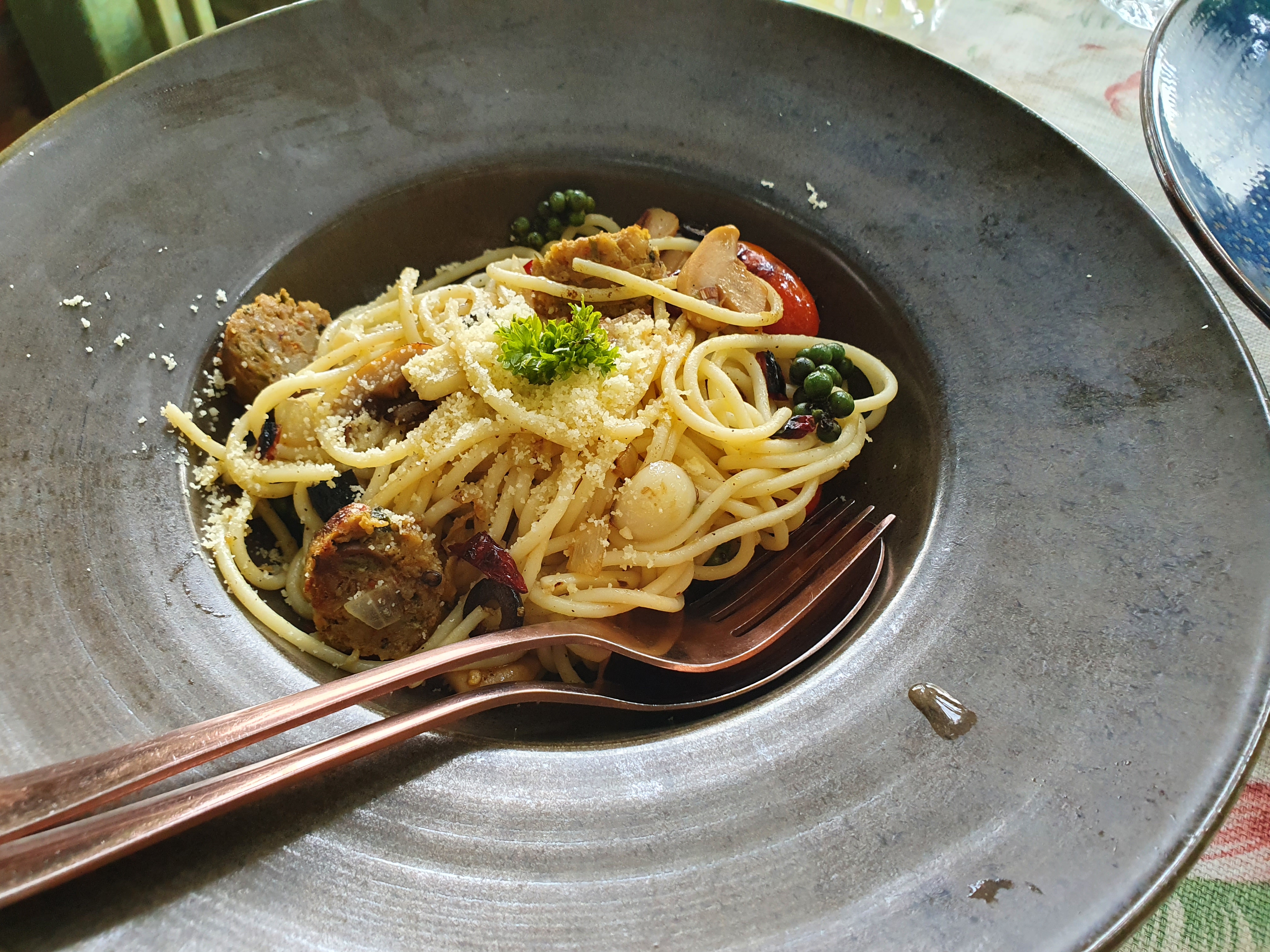 태국 소시지가 들어간 태국식 스파게티로 요즘 태국에서 없는 집은 없는 메뉴같다. 실제 태국 메뉴를 면만 스파게티 면을 넣어서 볶은 요리로 와이프는 조금 싱겁다고 소금을 더 쳐서 먹었다.