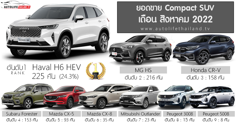 1위는 하발에서 호주 등 해외에 판매하고 있는 대표 모델 H6 가 2,730 대로 차지했다. 다음달에 발표될 PHEV 플러그인 하이브리드(스펙상으로는 전기 충전으로 총 201km를 달릴 수 있다고 함) 를 가 대기하고 있어 계속 1위를 유지할 가능성이 높아 보인다. 2위는 같은 중국의 MG 사의 HS 가 차지 했다. 3위는 풀체인지 모델을 앞두고 있는 혼다 CR-V가 차지 했다. 미국에서는 6세대 CR - V 를 선보였는데 조만간 태국에서도 생산 계획과 함께 출시 계획을 발표 할 것으로 보인다.