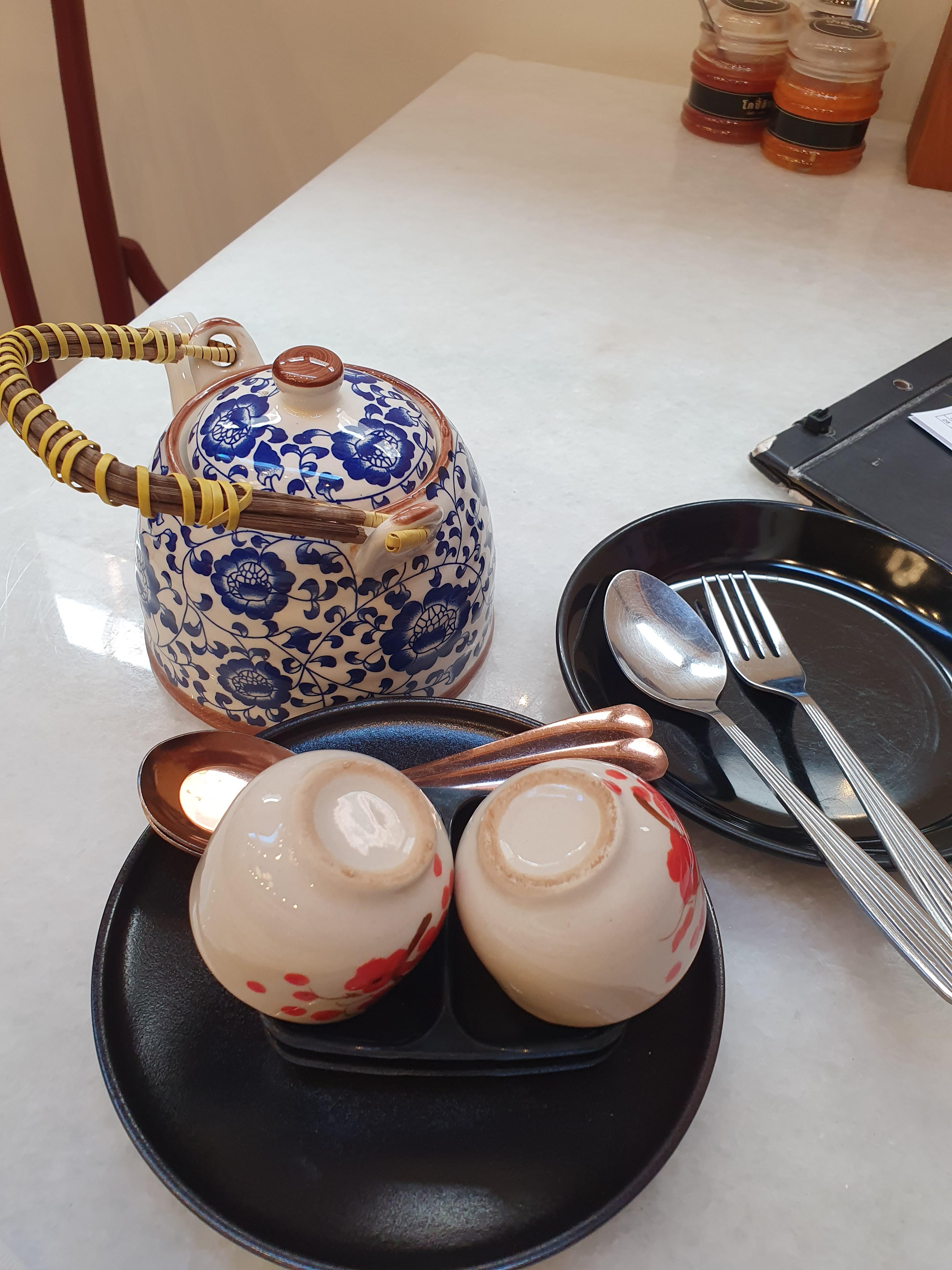 리필이 가능한 무료 차가 제공되는데 따뜻하게 서비스한다. 태국도 로컬 식당으로 갈 수록 기본적으로 물을 제공하거나 차를 제공하는데 그런 개념을 그대로 유지하고 있는 것으로 보인다. 필자는 태국 국수집에서 주는 물은 안 먹고 꼭 주문해서 먹는 편인데 이곳의 차는 무료로 주는 특유의 수돗물 냄새나 그런 것들이 없어서 리필을 두 번이나 했다. 또한 약간 기름진 음식에는 따뜻한 차가 잘 어울린다. 결국에는 콜라를 사서 마시긴 했지만 말이다.