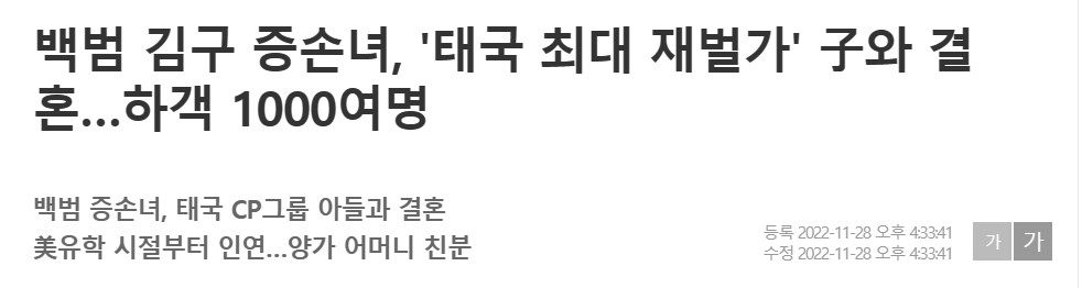 마지막으로 백범 김구 선생님의 증손녀가 CP 그룹과 결혼을 한 기사가 큰 화제가 한국에서 되었는데 그것또한 앞서 언급한 내용들의 연속성이 아닌가 한다.