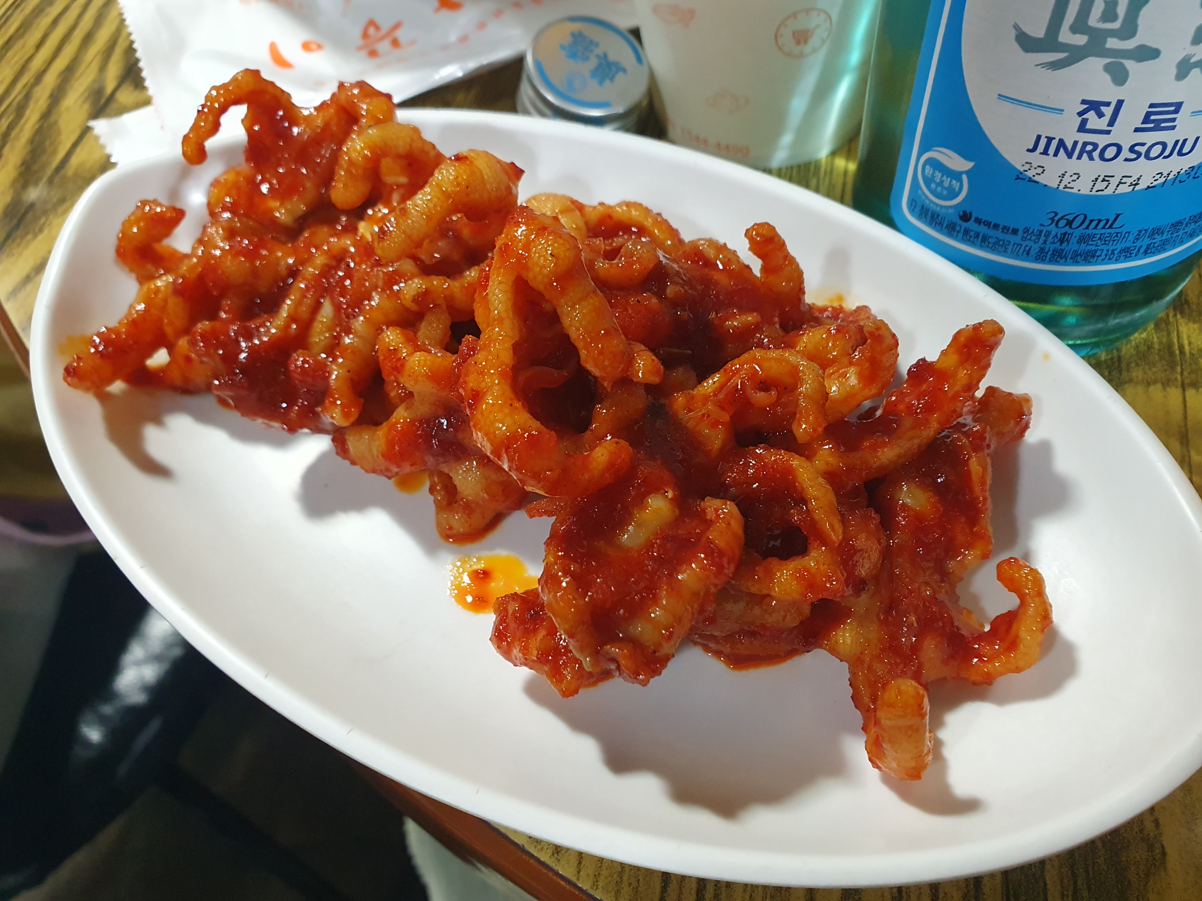 뼈 없는 닭발을 팔고 있었는데 개인적으로는 막창보다 닭발이 더 맛있었다. 태국에서는 뼈 없는 닭발을 보기 힘들다. 예전에 발골하는 태국 직원이 입으로 하는 장면이 찍히고 나서부터는 자취를 아예 감춘 것 같다. 그리고 원래 뼈 있는 채로 요리를 하는데 한국식 닭발은 역시 마음에 든다.