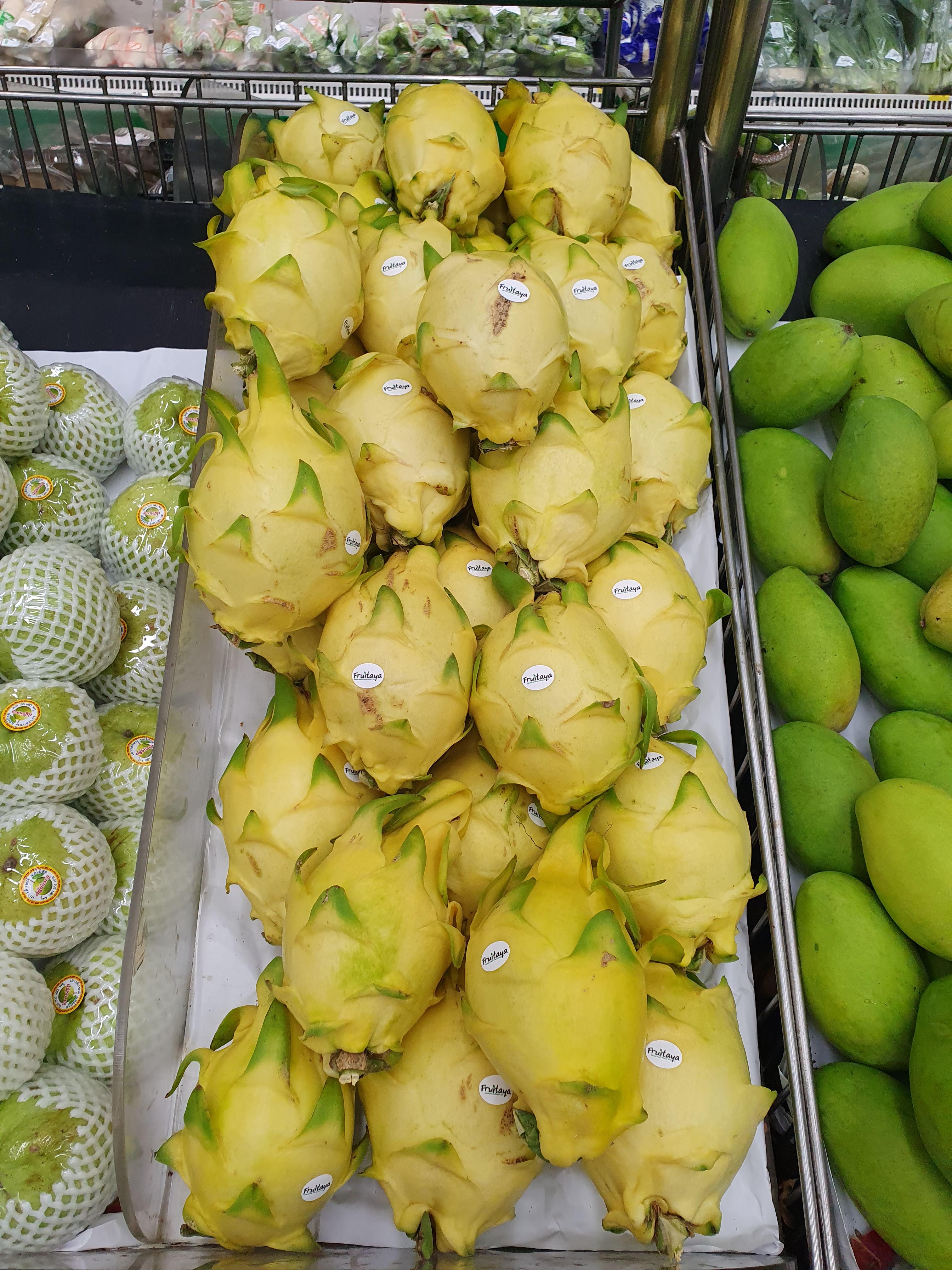 동남아시아는 과일의 천국답게 수많은 과일이 나오고 있고 품종개량도 계속되고 있는 모양이다. 빨간색에 안은 흰 것이 씨가 빽빽하게 박혀 있는 일반적인 용과가 가장 일반적이었다면 최근에는 겉과 속이 모두 빨간색이 나오더니 오늘은 노란색 껍질의 용과를 만났다.