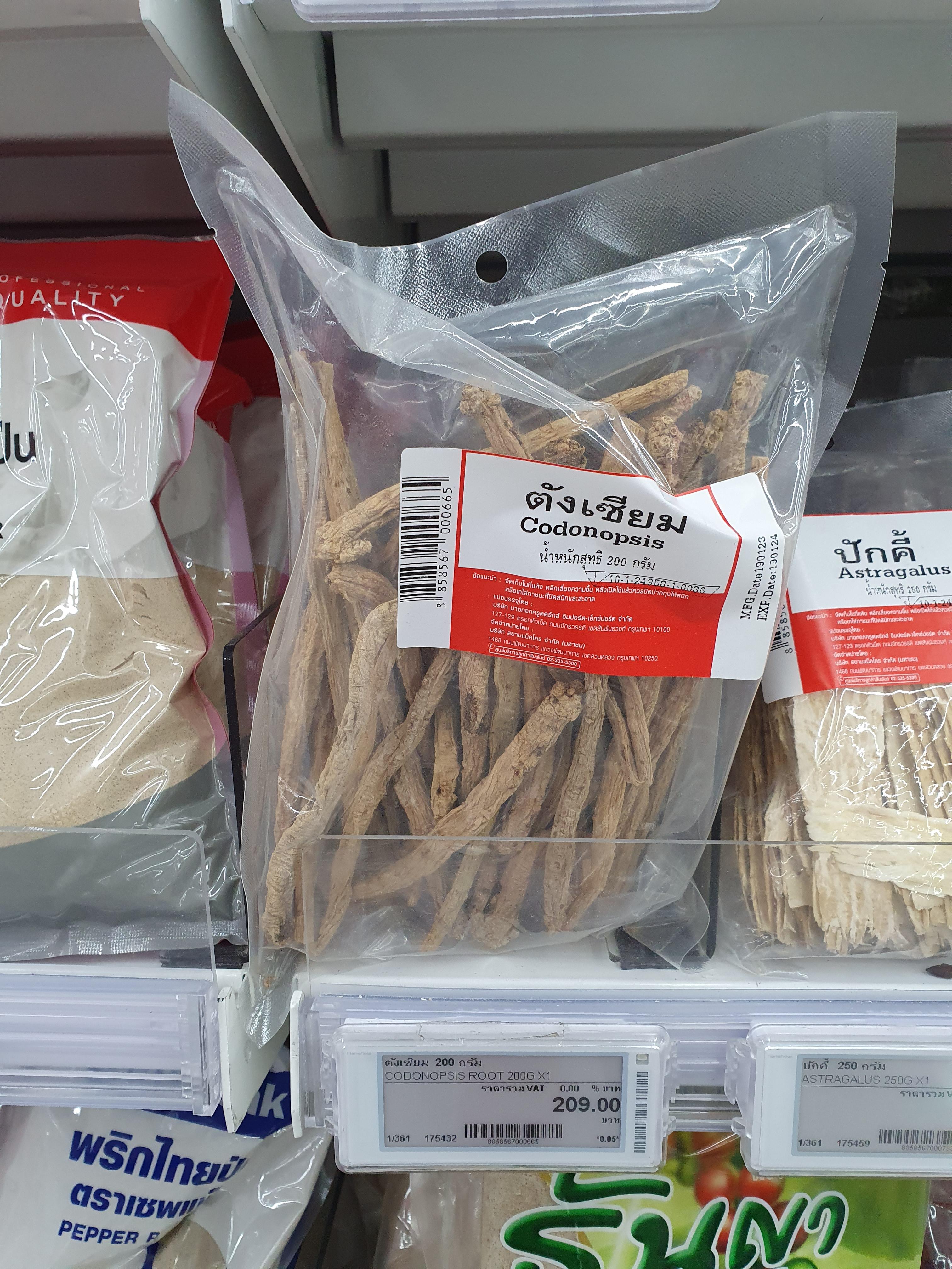 더덕과라고 나오는데 먹어보니 정확히 더덕보다 삼에 가까운 맛이 난다. 삼계탕과 백숙의 중간에 있는 밥솥으로 끓이는 닭 요리에 넣어 먹을꺼라 몸에만 좋으면 된다. 월계수 잎과 양파, 파 등을 넣고 밥솥 취사를 누르면 끝이 나는 마법의 요리. 마크로(Makro) 식자재 마트에서 Codonopsis 라고 판매한다. 200g 당 209바트다.
