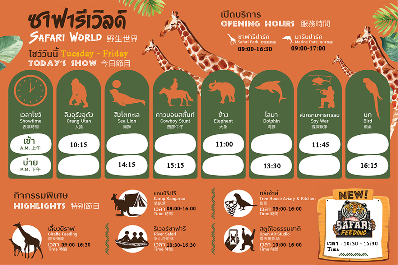태국 온라인에서 판매되고 있는 사파리 월드 입장권 중 사파리 파크와 마린 파크를 따로 판매하는 경우가 있다. 그러니 검색해서 입장권을 발견하면 사파리 파크와 마린 파크가 둘 다 포함되어 있는지 확인해야 한다. 아침 오픈시간부터 가서 마린 파크 쇼타임 일정을 따라다니면서 구경하게 되면 동물원이 문 닫는 시간까지 놀 수 있다. 그래서 개인 차량으로 굳이 안 붙여도 되고 한 번에 다 보고 싶으면 둘 다 포함된 입장권을 사기를 추천한다.