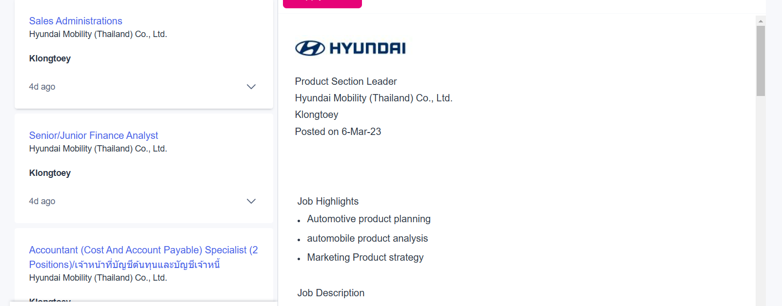 마지막으로 3월 초에 올라온 태국 채용공고다. 현대모빌리티라는 회사명으로 4개 파트에 구인 공고를 올려 찾고 있다.