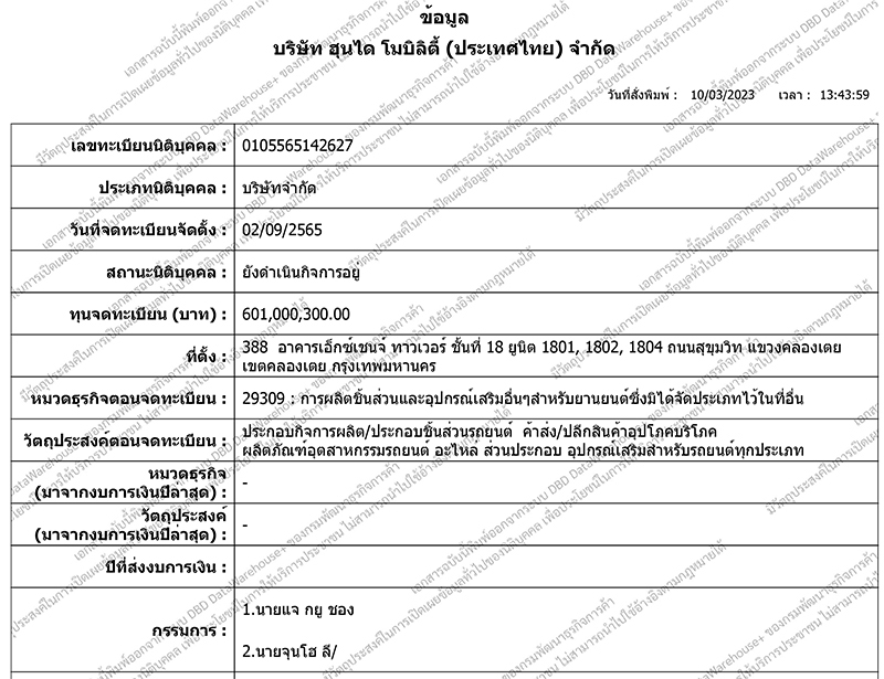 Hyundai Mobility (Thailand) บริษัทแม่จากเกาหลีใต้ เพิ่มทุนจด 600