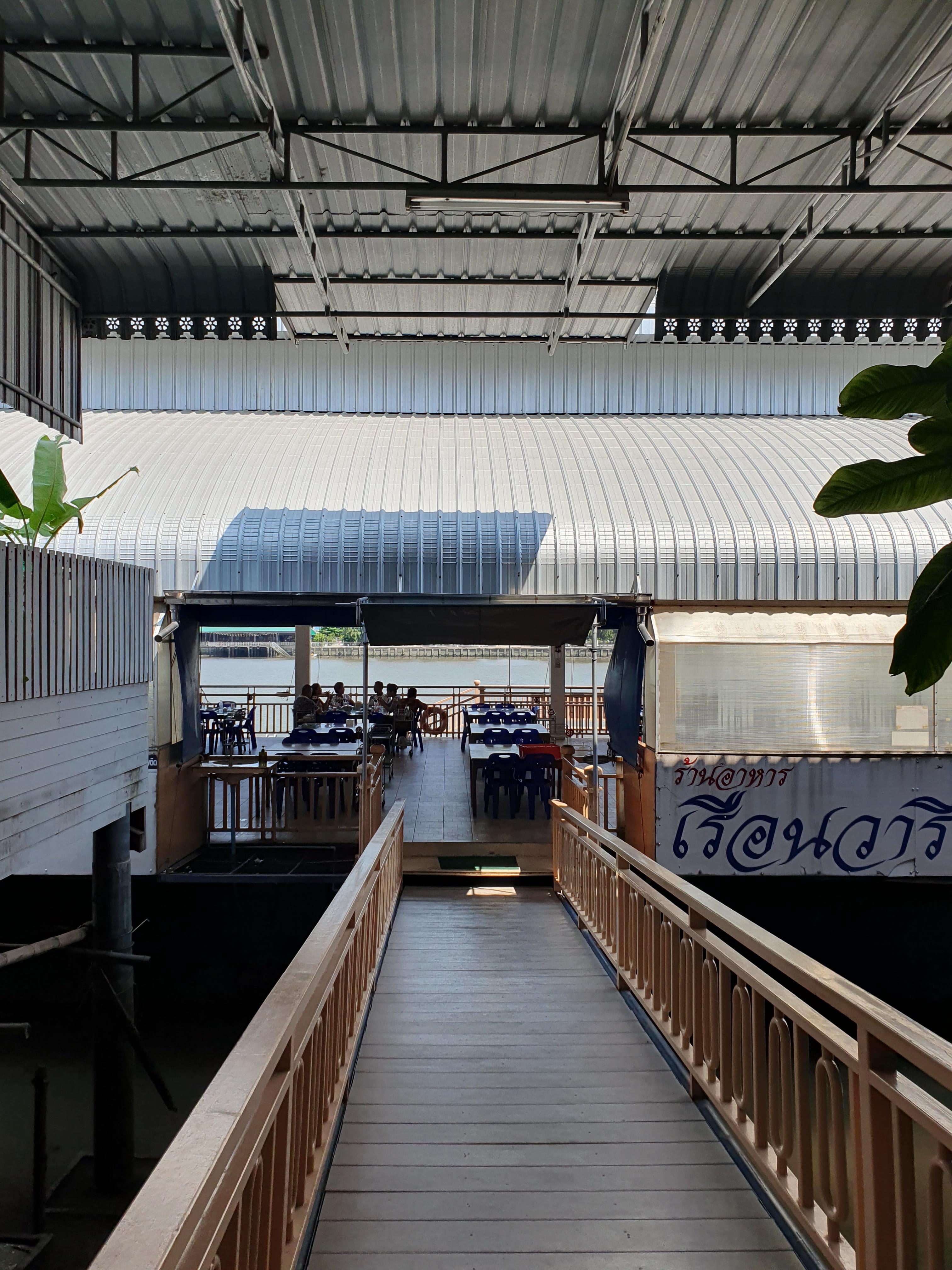 테이블이 있는 배로 가는길인데 사진에서처럼 크기 때문에 전혀 걱정할 일이 없다. 오히려 강에 떠 있는 상태라 아이들이 즐거워하면서 음식을 기다릴 수 있었다. 란아한 르언와리 라고 크게 적혀 있다. 영어로 하면 외국인들이 더 많이 올 텐데 처음에 갈 때 조금 긴가민가했다.