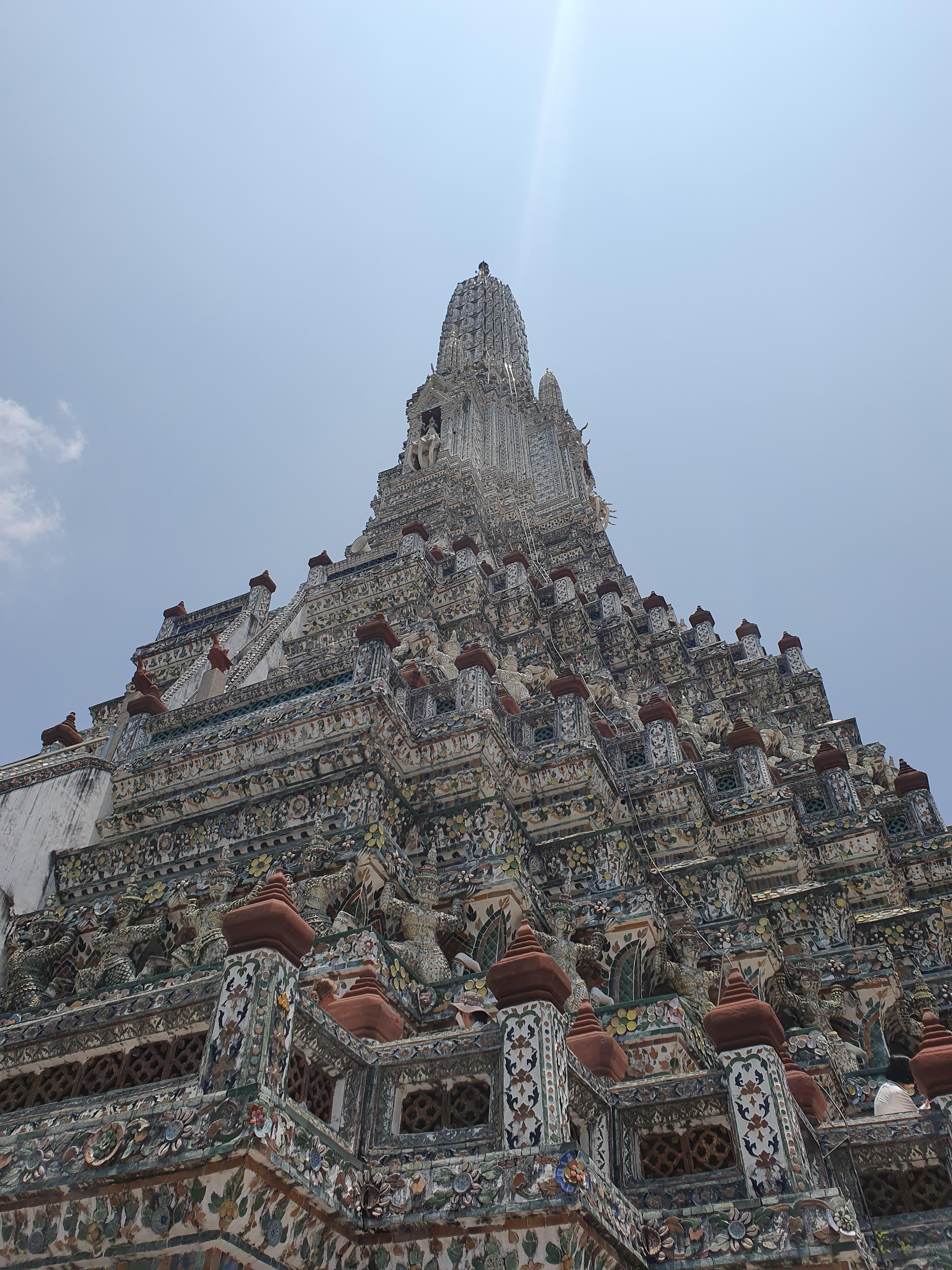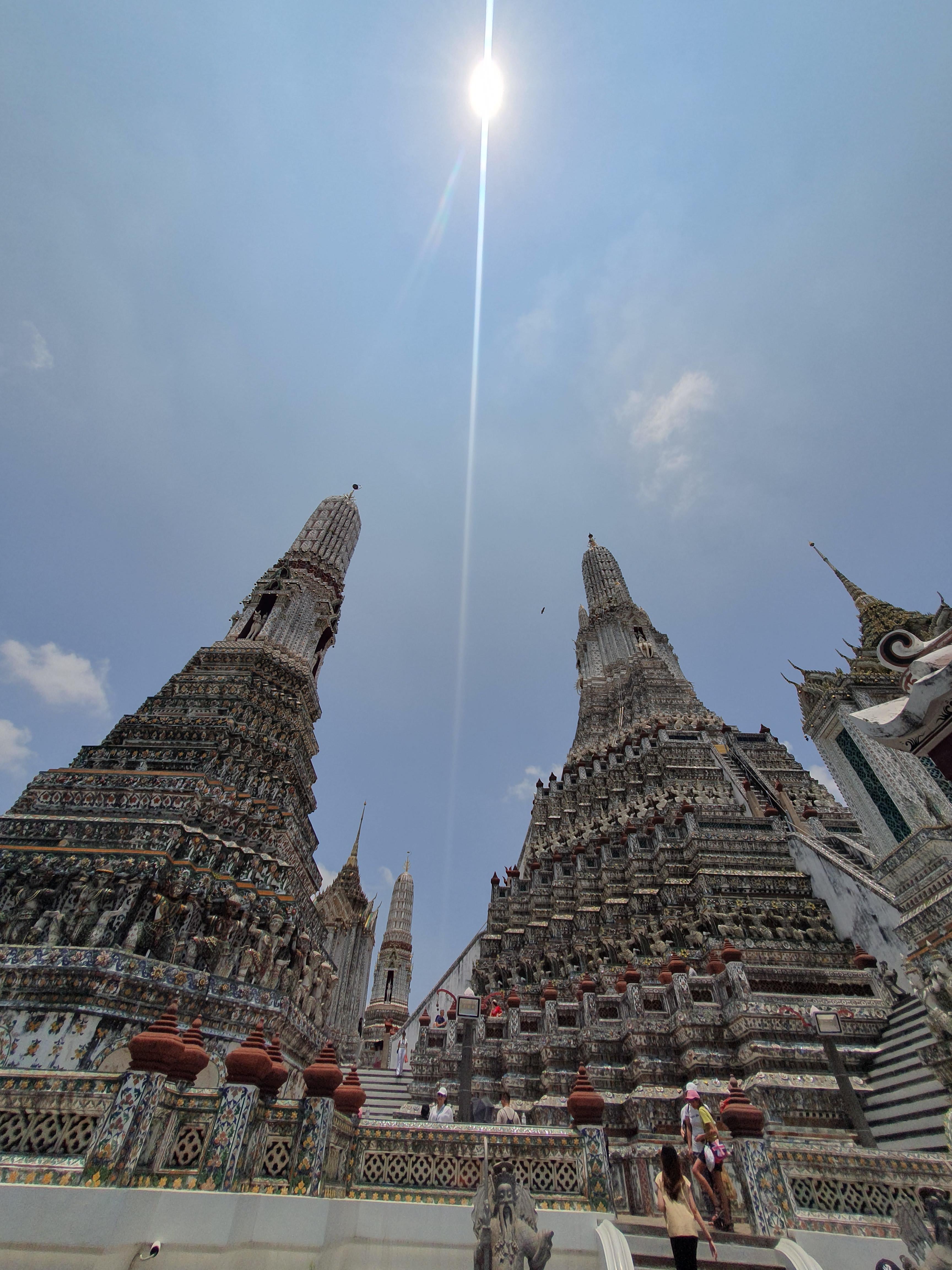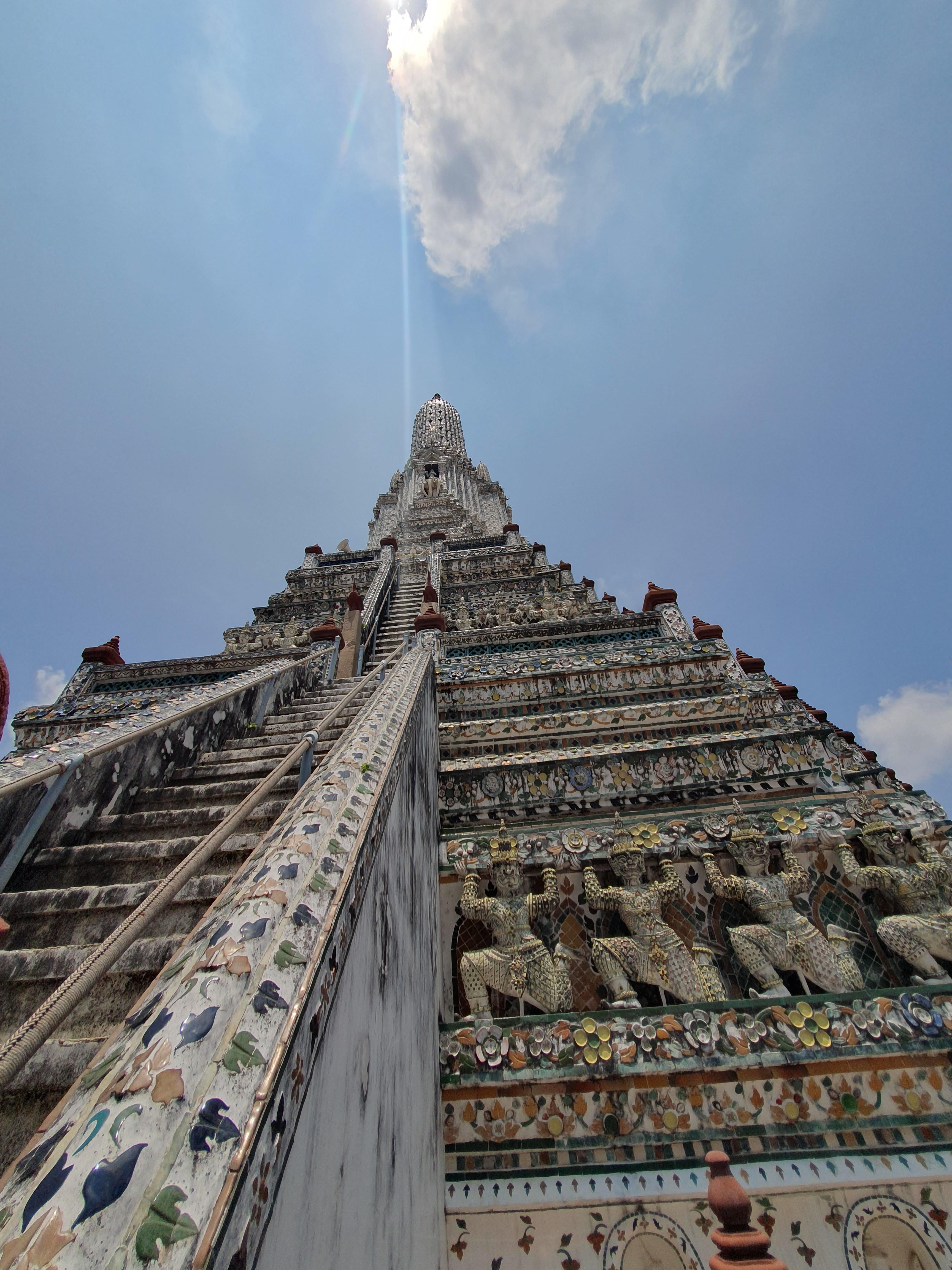 태국의 피라미드라고 표현한 이유는 계단식으로 올라 갈 수 있도록 되어 있는 것이 흡사했기 때문이다. 태국에서 대부분 황금색상의 치장으로 만들어진 사원이나 탑이 많은데 이곳은 흰색 바탕이라 더욱 눈에 띄는 모습이다. 주변 국가 앙코르와트는 이런 탑들이 훨씬 더 많고 신비로운 분위기를 주고 피라미드는 규모에서 압도적으로 더 크지만 태국 방콕의 왓아룬도 참 아름다운 매력을 지니고 있어 태국 방콕 일정을 계획한다면 반대편에서 일몰 레스토랑에서 바라보는 것도 좋지만 모자를 쓰고 한번 방문해 보는 것도 좋아 보인다.