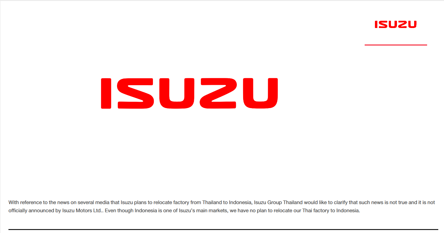 이렇게 사랑받는 이스즈가 태국 공장을 빼서 인도네시아로 옮긴다고 하니 동남아시아에서 자동차 생산 강국으로써 자존심이 높던 태국인들에게 상처가 될 뉴스였던 것이다. 어제 이스즈 태국은 공식 보도자료를 내면서 "인도네시아 시장은 상당히 중요한 시장이지만 이전 계획은 없다." 라고 발표했다. 하지만 그전에 태국에서 나온 뉴스들을 종합해 보면 기존에 있던 인도네시아의 이스즈 공장에 태국 공장을 이전할 계획이며 인도네시아 정부 측 인원과 일본에서 이스즈 본사 직원들이 축하 행사까지 열었다고 한다.