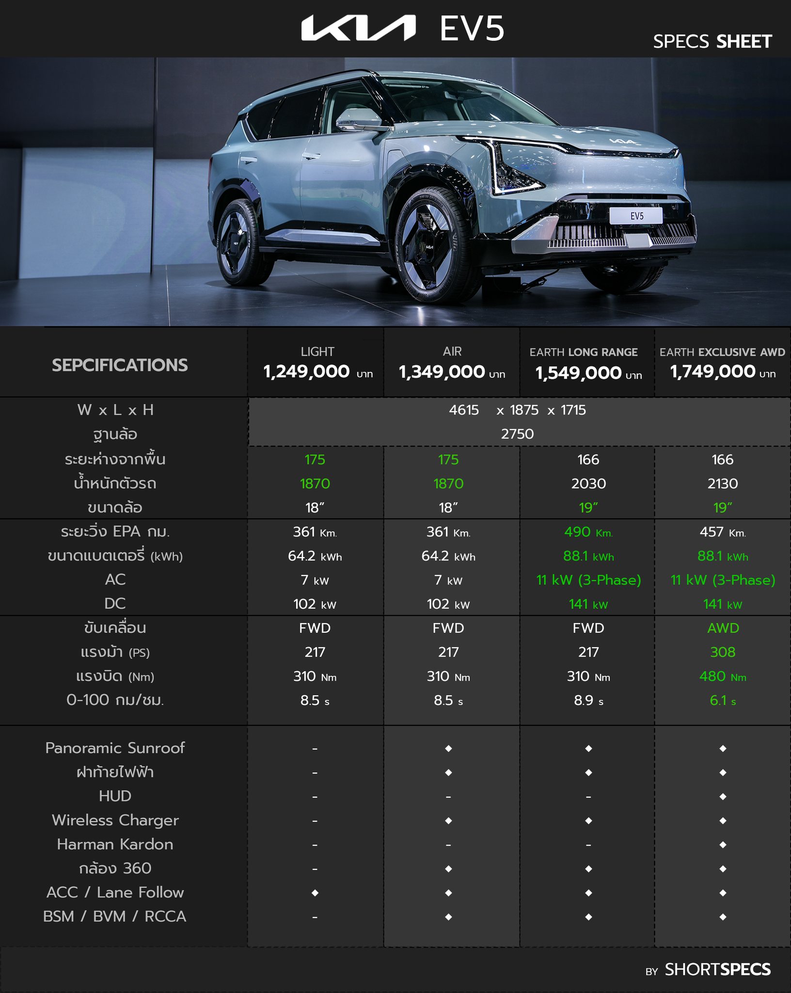 기아 EV5 트림별 차이 차트다. 주변 전기차를 사용하고 있는 이용자들의 이야기를 들어보면 한국과 다른점이 최대 가능거리에 대한 집착이 많이 없다는 점이다. 대부분 집밥이나 회사밥이 가능한 상황인 오너들이 많다 보니 충전에 대한 스트레스가 적은 편이고 교통체증이 아주 심한 태국 방콕 시내에서 운행하는 용도로 출고하는 경우가 많아서 최대 거리보다는 실내 기능과 사이즈, 디자인등이 더 많은 영향을 받는 것을 볼 수 있다. 지방이나 장거리는 롯뚜(승합차)라고 해서 알파드나 현대 H-1 처럼 승합차를 주로 이용하는 사람들이라 더욱더 그런 것으로 보인다.