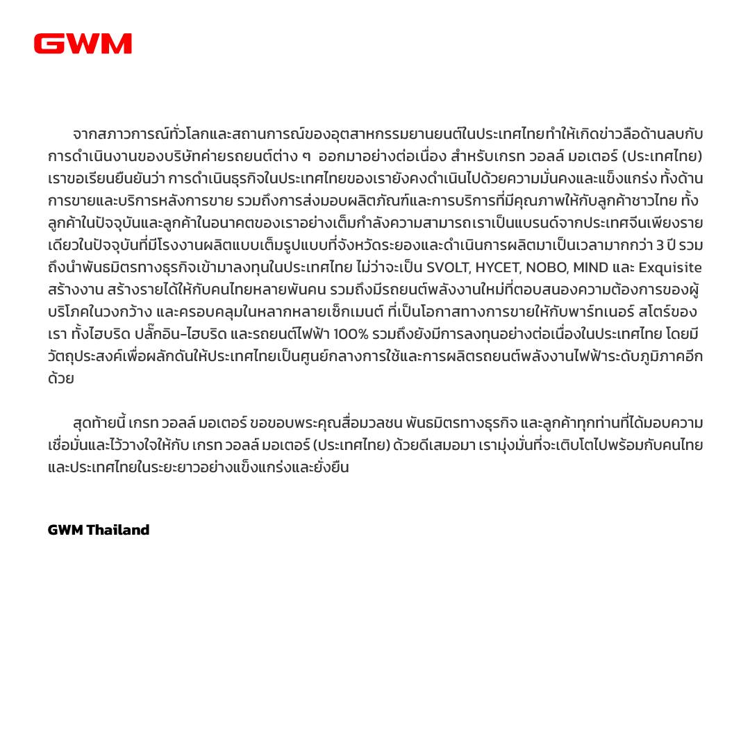 빠르게 GWM 태국은 공식 성명서를 발표했다. 주요 내용은 태국에 생산 공장을 가지고 여러 중국 자동차 기업들과 협업을 하면서 태국내에 많은 일자리 창출과 3년 이상 태국 자체생산으로 판매하고 있는 유일한 중국 자동차 브랜드로써 철수할 생각이 없고 더 태국을 전기차 시장 거점으로 사용할 계획이라는 내용과 함께 깔끔한 성명서를 발표했다.