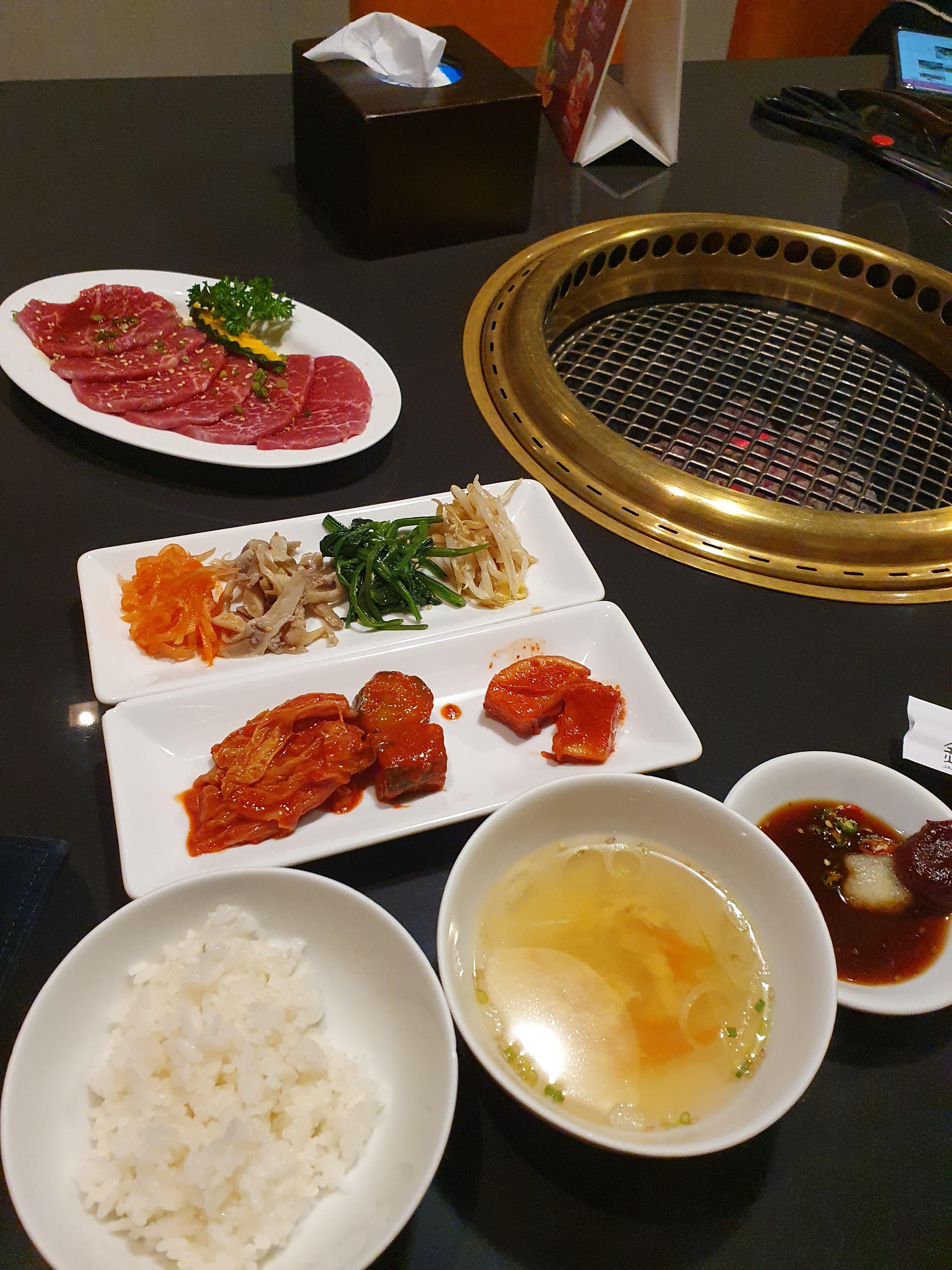 반찬과 공기밥은 무료로 추가되고 고기만 따로 추가 주문해야 한다. 요즘 일본 프리미엄 불고기든 뷔페 불고기든 한식인지 일식인지 구분이 안 가는 집들이 상당히 많다. 김치에 밥 그리고 고기까지 솔직히 한식 한상이다. 김치는 한국 업체나 한국 사람이 만든 맛은 아니고 태국에서 납품받았거나 긴자도 자체에서 만들었을 법한 맛이다. 나물은 간이 조금씩 빠져 있는데 소금 치면 꽤 깔끔한 맛이다. 소스는 고추, 마늘, 고추장이 기본 구비되어 있는데 고기 구워서 고추장 넣고 나물 싹 다 넣어서 비빔밥처럼 비벼 먹고 나왔다.