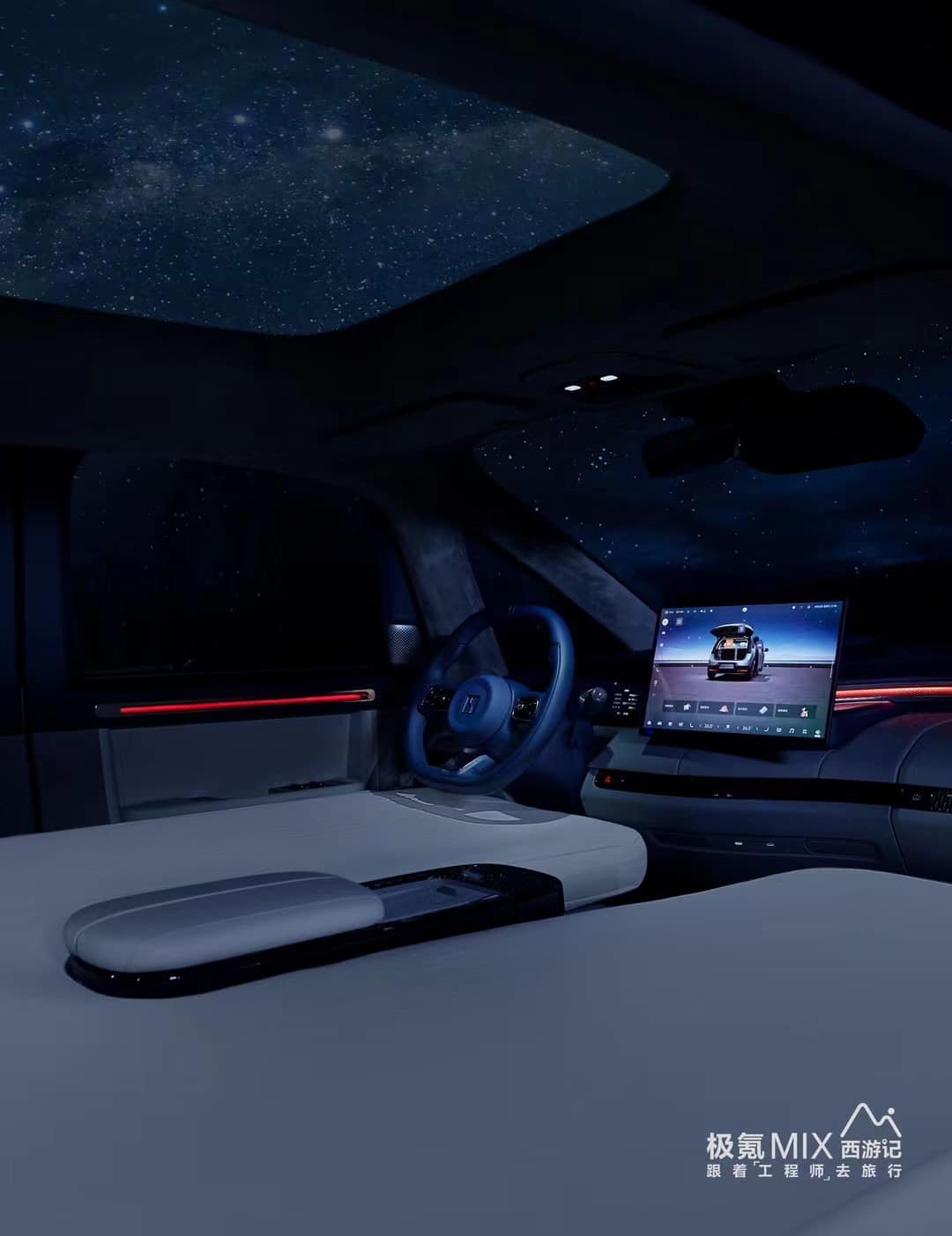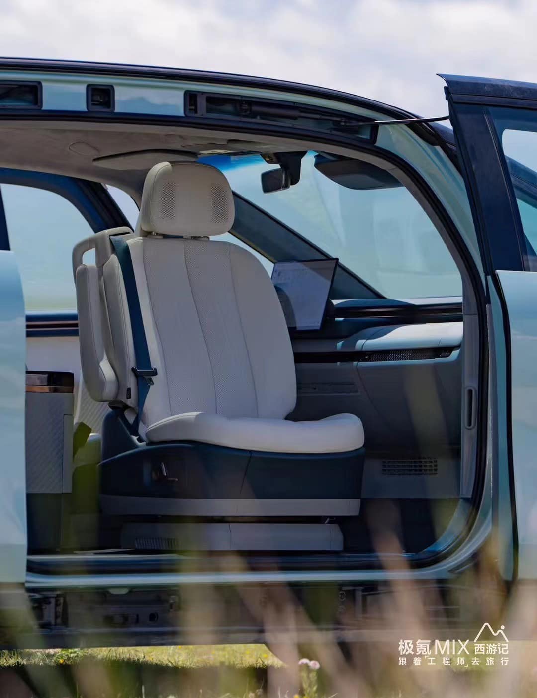 시트 구성이 굉장히 독특하다. 시트는 5개로 구성되어 있고 운전석과 조수석 그리고 벤치시트처럼 3인이 앉을 수 있는 2열 시트가 구성되어 있는데 360도 회전하기 때문에 저렇게 마주보고 앉아 있도록 만들어져 있다. 현대 자동차 그룹에서 기아와 스타리아에서 360도 회전 좌석과 가변식 콘솔을 선보인적이 있는데 활용도가 떨어진다는 평가가 많지만, 지커 믹스는 정확하게 고객이 원하는 포인트를 잘 잡아서 적용시킨 것으로 보인다.